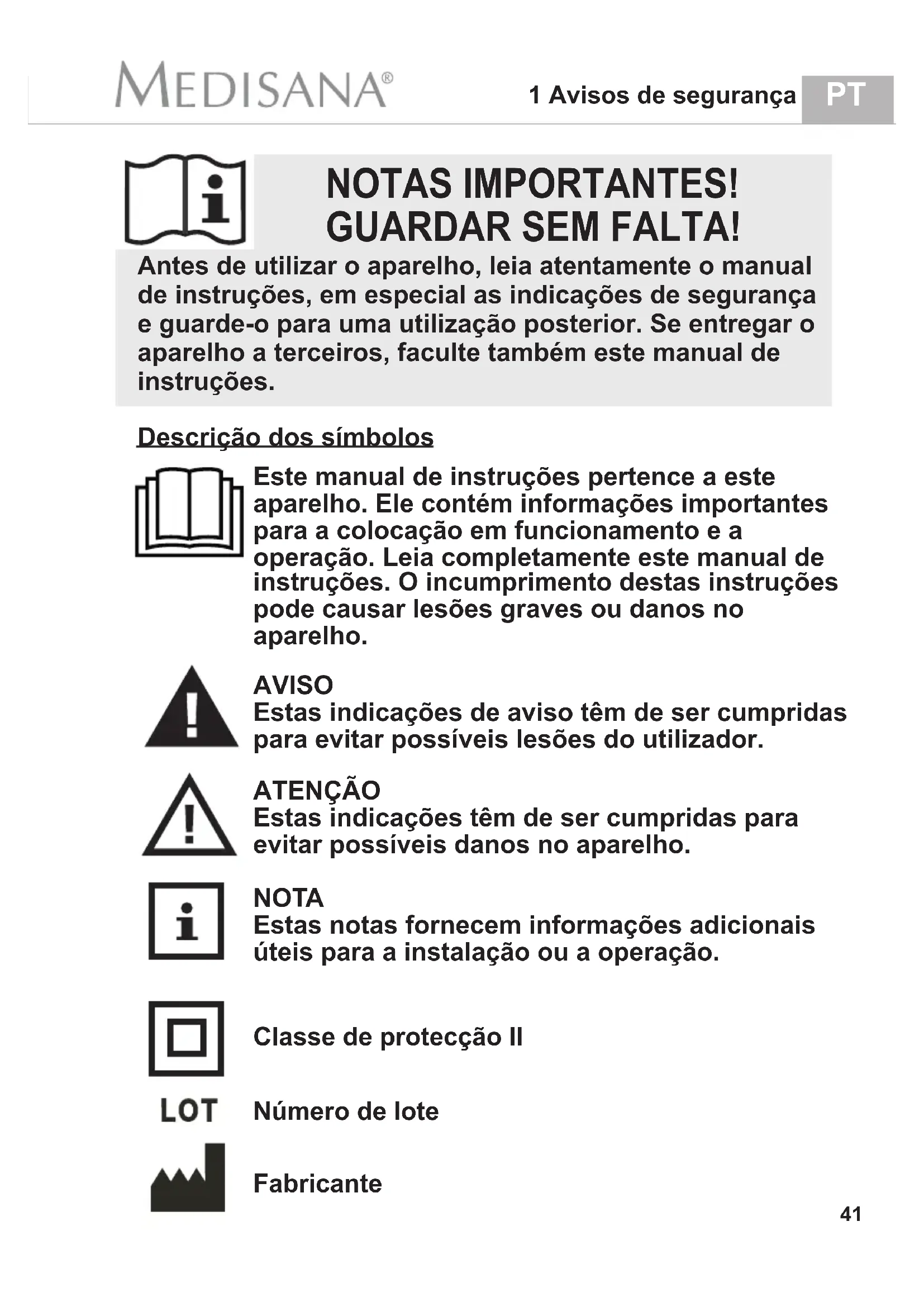 tos causados por el dispositivo, aunque el daño en el dispositivo haya sido considerado como una reclamación justificada. Condiciones de garantía y reparación Encontrará la dirección de nuestra asistencia técnica en la hoja anexa. MEDISANA AG Jagenbergstraße 19 41468 NEUSS Alemania eMail: info@medisana.de Internet: www.medisana.comPT 1 Avisos de segurança NOTAS IMPORTANTES! GUARDAR SEM FALTA! Este manual de instruções pertence a este aparelho. Ele contém informações importantes para a colocação em funcionamento e a operação. Leia completamente este manual de instruções. O incumprimento destas instruções pode causar lesões graves ou danos no aparelho. AVISO Estas indicações de aviso têm de ser cumpridas para evitar possíveis lesões do utilizador. ATENÇÃO Estas indicações têm de ser cumpridas para evitar possíveis danos no aparelho. NOTA Estas notas fornecem informações adicionais úteis para a instalação ou a operação. Classe de protecção II Descrição dos símbolos Número de lote Fabricante Antes de utilizar o aparelho, leia atentamente o manual de instruções, em especial as indicações de segurança e guarde-o para uma utilização posterior. Se entregar o aparelho a terceiros, faculte também este manual de instruções. 41• Antes de conectar o aparelho à sua alimentação de corrente, tenha atenção para que a tensão eléctrica indicada na chapa de identificação corresponda à da sua rede eléctrica. Mantenha o cabo de alimentação e o aparelho afastados de superfícies quentes, da humidade e de líquidos. Nunca segure a ficha de rede ou o interruptor de rede com mãos molhadas ou húmidas ou se estiver com os pés dentro de água. Não tente apanhar um aparelho que tenha caído para dentro da água. Retire imediatamente a ficha de rede da tomada. Ligue a unidade de modo a que a ficha fique facilmente acessível. Desligue o aparelho sempre imediatamente após a sua utilização através dos botões na unidade de comando e retire a ficha de rede da tomada. Para desligar o aparelho da rede eléctrica, nunca puxe pelo cabo eléctrico, mas sempre pela ficha perto da tomada. Não transporte, puxe ou rode o aparelho pelo cabo de alimentação. Se o cabo de rede estiver danificado, só pode ser substituído pela MEDISANA, por um comerciante especializado autorizado ou por uma pessoa igualmente qualificada, de modo a evitar situações de perigo. Tenha atenção para que não se tropece no cabo. Ele não deve ficar dobrado, esmagado ou torcido.