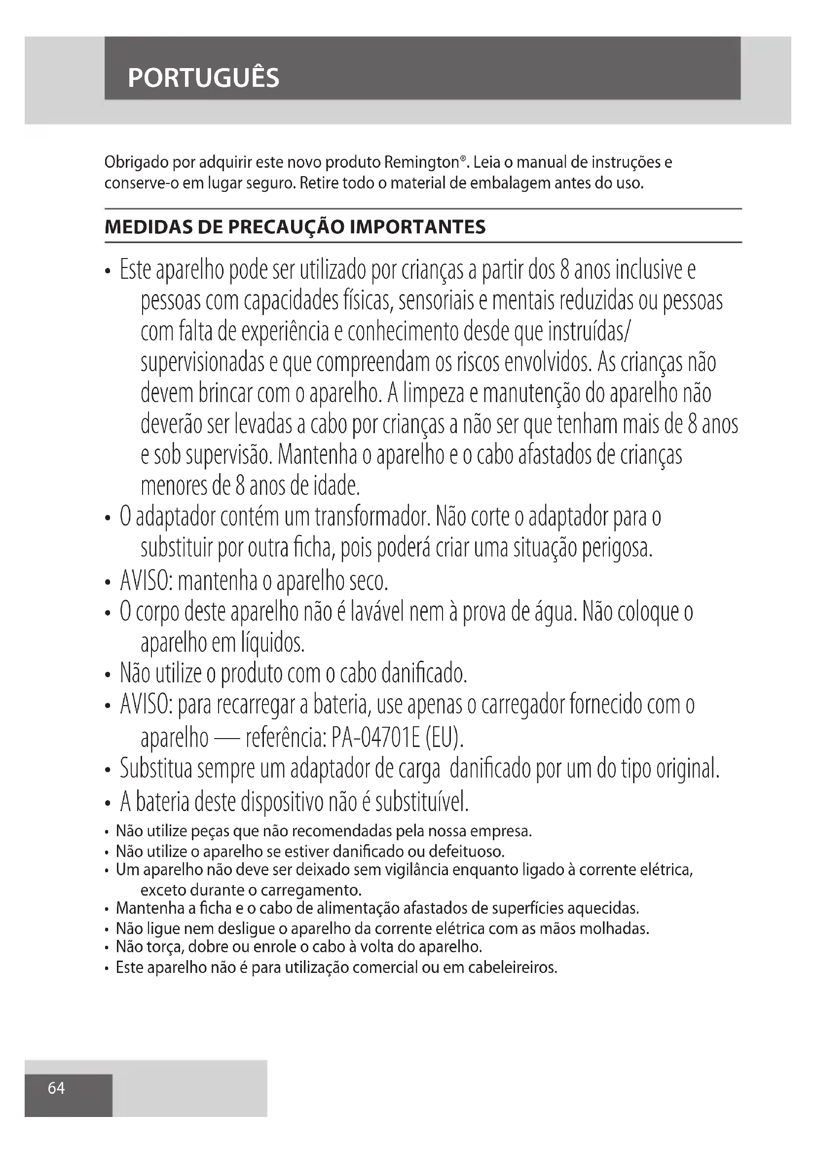 - AVISO: para recarregar a bateria, use apenas o carregador fornecido com o aparelho — referência: PA-04701E (EU).