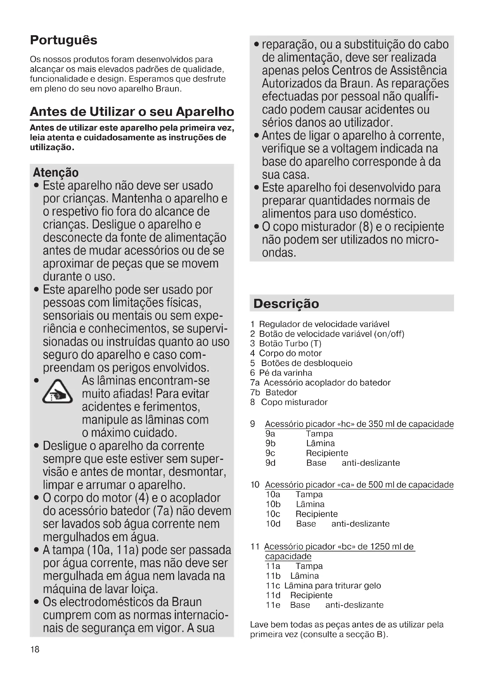 - Volte a picar durante mais 1,5 segundos. Outras aplicações para o acessório picador «bc» (11) Com o acessório picador «bc», também pode fazer batidos ou bebidas, misturar massas leves ou triturar cubos de gelo. Misturar massa para panquecas Em primeiro lugar, verta 375 ml de leite no recipiente, depois adicione 250 g de farinha e, por fim, 2 ovos. Use a velocidade «T» e bata a massa até ficar macia. Picar cubos de gelo – Coloque a lâmina para triturar gelo (11c) no espigão do centro do recipiente (11d) e pressione-a para baixo até bloquear. – Coloque até 7 cubos de gelo no recipiente e feche com a tampa. Insira o corpo do motor e utilize o nível de velocidade máximo. – Após a utilização, separe o corpo do motor e retire a tampa e a lâmina para triturar gelo. – Retire o gelo picado ou deite a sua bebida no jarro para servir à mesa. Limpeza O corpo do motor (4) e o acoplador do acessório batedor (7a) só podem ser limpos com um pano húmido. A tampa (10a, 11a) pode ser passada por água corrente, mas não deve ser mergulhada em água nem lavada na máquina de lavar loiça. Todas as outras peças podem ser lavadas na máquina de lavar loiça. Pode retirar as bases anti-deslizantes dos recipientes do picador para uma melhor limpeza. Quando se preparam alimentos de cores intensas (como cenouras, por exemplo), as peças de plástico podem ficar manchadas. Limpe estas peças com óleo vegetal alimentar antes de as lavar. Acessórios (podem ser comprados individualmente, não disponível em todos os países) MQ 10: Batedor para preparar chantilly, bater claras em castelo e sobremesas instantâneas de pacote MQ 20: Acessório picador de 350 ml de capacidade, para picar ervas aromáticas, cebolas, alho, malaguetas, frutos secos, etc MQ 30: Acessório picador de 500 ml de capacidade, para picar cenouras, carne, cebolas, etc. MQ 40: Acessório picador de 1250 ml de capacidade, para picar, misturar, liquidificar e triturar gelo MQ 50: Acessório para puré para fazer puré de legumes e batatas cozidos MQ 70: Acessório de cozinha compacto (1500 ml) para picar, misturar, laminar e ralar. Sujeito a alterações sem aviso prévio. Não deite o produto no lixo doméstico no final da sua vida útil. Poderá entregá-lo num Centro de Assistência da Braun ou num dos pontos de recolha ou reciclagem previsto para esse efeito. 5722111864_MQ5000-MQ5045_INT_S6-80.indd 20 30.09.15 11:1421 Italiano I nostri prodotti sono progettati per soddisfare gli standard più elevati in termini di qualità, funzionalità e design. Ci auguriamo che l’elettrodomestico Braun soddisfi appieno le vostre esigenze. Prima dell’utilizzo Prima di usare il prodotto, leggere attentamente e interamente le istruzioni. Attenzione