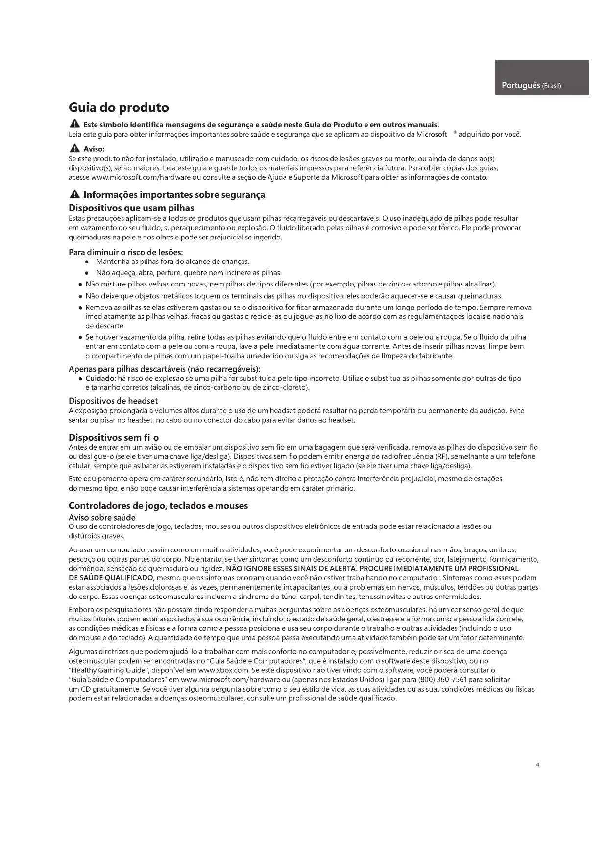 adquirido por você. Aviso: Se este produto não for instalado, utilizado e manuseado com cuidado, os riscos de lesões graves ou morte, ou ainda de danos ao(s) dispositivo(s), serão maiores. Leia este guia e guarde todos os materiais impressos para referência futura. Para obter cópias dos guias, acesse www.microsoft.com/hardware ou consulte a seção de Ajuda e Suporte da Microsoft para obter as informações de contato. Informações importantes sobre segurança Dispositivos que usam pilhas Estas precauções aplicam-se a todos os produtos que usam pilhas recarregáveis ou descartáveis. O uso inadequado de pilhas pode resultar em vazamento do seu fl uido, superaquecimento ou explosão. O fl uido liberado pelas pilhas é corrosivo e pode ser tóxico. Ele pode provocar queimaduras na pele e nos olhos e pode ser prejudicial se ingerido. Para diminuir o risco de lesões: ● Mantenha as pilhas fora do alcance de crianças. ● Não aqueça, abra, perfure, quebre nem incinere as pilhas. ● Não misture pilhas velhas com novas, nem pilhas de tipos diferentes (por exemplo, pilhas de zinco-carbono e pilhas alcalinas). ● Não deixe que objetos metálicos toquem os terminais das pilhas no dispositivo: eles poderão aquecer-se e causar queimaduras. ● Remova as pilhas se elas estiverem gastas ou se o dispositivo for ficar armazenado durante um longo período de tempo. Sempre remova imediatamente as pilhas velhas, fracas ou gastas e recicle-as ou jogue-as no lixo de acordo com as regulamentações locais e nacionais de descarte. ● Se houver vazamento da pilha, retire todas as pilhas evitando que o fluido entre em contato com a pele ou a roupa. Se o fluido da pilha entrar em contato com a pele ou com a roupa, lave a pele imediatamente com água corrente. Antes de inserir pilhas novas, limpe bem o compartimento de pilhas com um papel-toalha umedecido ou siga as recomendações de limpeza do fabricante. Apenas para pilhas descartáveis (não recarregáveis): ● Cuidado: há risco de explosão se uma pilha for substituída pelo tipo incorreto. Utilize e substitua as pilhas somente por outras de tipo e tamanho corretos (alcalinas, de zinco-carbono ou de zinco-cloreto). Dispositivos de headset A exposição prolongada a volumes altos durante o uso de um headset poderá resultar na perda temporária ou permanente da audição. Evite sentar ou pisar no headset, no cabo ou no conector do cabo para evitar danos ao headset. Dispositivos sem fi o Antes de entrar em um avião ou de embalar um dispositivo sem fi o em uma bagagem que será verifi cada, remova as pilhas do dispositivo sem fi o ou desligue-o (se ele tiver uma chave liga/desliga). Dispositivos sem fi o podem emitir energia de radiofrequência (RF), semelhante a um telefone celular, sempre que as baterias estiverem instaladas e o dispositivo sem fi o estiver ligado (se ele tiver uma chave liga/desliga). Este equipamento opera em caráter secundário, isto é, não tem direito a proteção contra interferência prejudicial, mesmo de estações do mesmo tipo, e não pode causar interferência a sistemas operando em caráter primário. Controladores de jogo, teclados e mouses Aviso sobre saúde O uso de controladores de jogo, teclados, mouses ou outros dispositivos eletrônicos de entrada pode estar relacionado a lesões ou distúrbios graves. Ao usar um computador, assim como em muitas atividades, você pode experimentar um desconforto ocasional nas mãos, braços, ombros, pescoço ou outras partes do corpo. No entanto, se tiver sintomas como um desconforto contínuo ou recorrente, dor, latejamento, formigamento, dormência, sensação de queimadura ou rigidez, NÃO IGNORE ESSES SINAIS DE ALERTA. PROCURE IMEDIATAMENTE UM PROFISSIONAL DE SAÚDE QUALIFICADO, mesmo que os sintomas ocorram quando você não estiver trabalhando no computador. Sintomas como esses podem estar associados a lesões dolorosas e, às vezes, permanentemente incapacitantes, ou a problemas em nervos, músculos, tendões ou outras partes do corpo. Essas doenças osteomusculares incluem a síndrome do túnel carpal, tendinites, tenossinovites e outras enfermidades. Embora os pesquisadores não possam ainda responder a muitas perguntas sobre as doenças osteomusculares, há um consenso geral de que muitos fatores podem estar associados à sua ocorrência, incluindo: o estado de saúde geral, o estresse e a forma como a pessoa lida com ele, as condições médicas e físicas e a forma como a pessoa posiciona e usa seu corpo durante o trabalho e outras atividades (incluindo o uso do mouse e do teclado). A quantidade de tempo que uma pessoa passa executando uma atividade também pode ser um fator determinante. Algumas diretrizes que podem ajudá-lo a trabalhar com mais conforto no computador e, possivelmente, reduzir o risco de uma doença osteomuscular podem ser encontradas no “Guia Saúde e Computadores”, que é instalado com o software deste dispositivo, ou no “Healthy Gaming Guide”, disponível em www.xbox.com. Se este dispositivo não tiver vindo com o software, você poderá consultar o “Guia Saúde e Computadores” em www.microsoft.com/hardware ou (apenas nos Estados Unidos) ligar para (800) 360-7561 para solicitar um CD gratuitamente. Se você tiver alguma pergunta sobre como o seu estilo de vida, as suas atividades ou as suas condições médicas ou físicas podem estar relacionadas a doenças osteomusculares, consulte um profi ssional de saúde qualifi cado. Português (Brasil)5 Convulsões por fotossensibilidade Um número muito reduzido de pessoas pode ter um ataque epiléptico ao serem expostas a determinadas imagens visuais, inclusive luzes ou padrões brilhantes que podem aparecer em videogames. Mesmo pessoas sem quaisquer antecedentes de tais ataques ou de epilepsia poderão sofrer de sintomas não diagnosticados que podem provocar estes “ataques de epilepsia fotossensível” ao verem videogames. Esses ataques podem ter diversos sintomas, incluind
