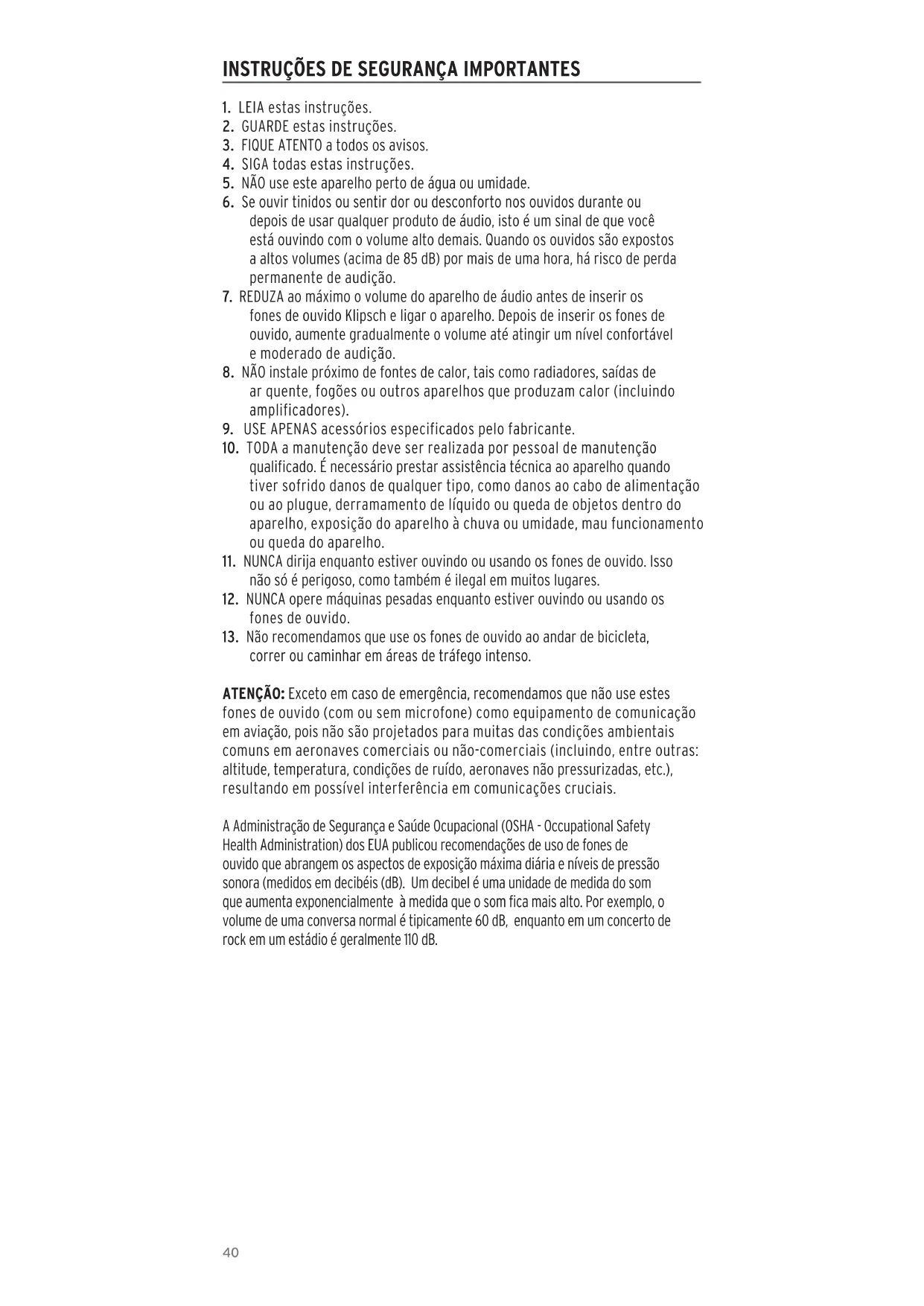 fones de ouvido Klipsch e ligar o aparelho. Depois de inserir os fones de ouvido, aumente gradualmente o volume até atingir um nível confortável e moderado de audição.