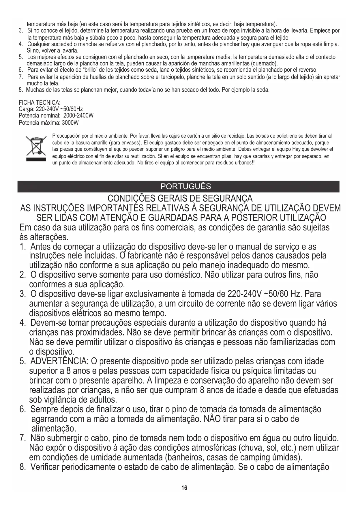 Potência nominal: 2000-2400W 5. Os melhores resultados atingem-se ao engomar a seco, a temperatura média: uma temperatura demasiado alta ou quando o ferro permanecer num mesmo lugar sem mover por muito tempo pôde causar a aparição de manchas amarelas (queimaduras). 2. No caso de tecido feito de fibras mistas (p. ex. : 40% de algodão, 60% de fibras sintéticas) regule a temperatura de engomar com base na fibra mais delicada. 1. Recomendamos engomar em temperatura baixa tecidos com um acabamento especial, ornamentos (tejoulas, bordados, etc.).kuris palaiko lizdą rankomis. Niekada neimkite maitinimo laido!