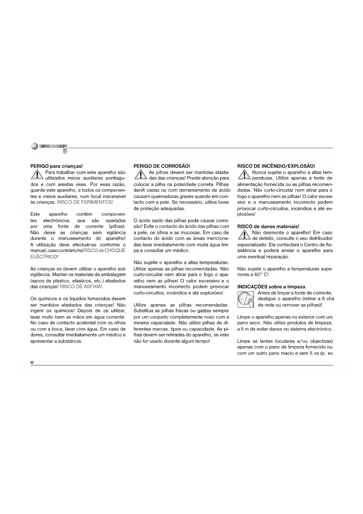 - confi rmar con <OK> Para que puedas disfrutar mucho tiempo con tu(s) microscopio ... Limpia las lentes (del ocular y/o del objetivo) sólo con el paño especial para lentes adjunto o con otro paño suave y que no suelte pelusas (p. ej. microfi bras). ¡No puedes presionar el paño con demasiada fuerza! Las lentes son de por sí muy sensibles y podrían rayarse. Si tu(s) microscopio está(n) muy sucio(s), pídeles a tus padres que te ayuden a limpiarlo(s). Humedece el paño con un poco de líquido de limpieza y frota con él las lentes sin hacer excesiva presión. ¡Presta atención para que tu(s) microscopio esté(n) protegido(s) siempre del polvo y la humedad! Tras utilizarlo(s), déjalo(s) un tiempo en una habitación cálida para que se evapore la humedad que pueda quedar. Coloca las tapas de protección contra el polvo y guarda el(los) microscopio en el maletín suministrado.51 ES52 PERIGO para crianças! Para trabalhar com este aparelho são utilizados meios auxiliares pontiagu- dos e com arestas vivas. Por essa razão, guarde este aparelho, e todos os componen- tes e meios auxiliares, num local inacessível às crianças. RISCO DE FERIMENTOS! Este aparelho contém componen- tes electrónicos, que são operados por uma fonte de corrente (pilhas). Não deixe as crianças sem vigilância durante o manuseamento do aparelho! A utilização deve efectuar-se conforme o manual, caso contrário há RISCO de CHOQUE ELÉCTRICO! As crianças só devem utilizar o aparelho sob vigilância. Manter os materiais da embalagem (sacos de plástico, elásticos, etc.) afastados das crianças! RISCO DE ASFIXIA! Os químicos e os líquidos fornecidos devem ser mantidos afastados das crianças! Não ingerir os químicos! Depois de os utilizar, lavar muito bem as mãos em água corrente. No caso de contacto acidental com os olhos ou com a boca, lavar com água. Em caso de dores, consultar imediatamente um médico e apresentar a substância. PERIGO DE CORROSÃO! As pilhas devem ser mantidas afasta- das das crianças! Preste atenção para colocar a pilha na polaridade correta. Pilhas danifi cadas ou com derramamento de ácido causam queimaduras graves quando em con- tacto com a pele. Se necessário, utilize luvas de proteção adequadas. O ácido saído das pilhas pode causar corro- são! Evite o contacto do ácido das pilhas com a pele, os olhos e as mucosas. Em caso de contacto do ácido com as áreas menciona- das lavar imediatamente com muita água lim- pa e consultar um médico. Não sujeite o aparelho a altas temperaturas. Utilize apenas as pilhas recomendadas. Não curto-circuitar nem atirar para o fogo o apa- relho nem as pilhas! O calor excessivo e o manuseamento incorrecto podem provocar curto-circuitos, incêndios e até explosões! Utilize apenas as pilhas recomendadas. Substitua as pilhas fracas ou gastas sempre por um conjunto completamente novo com a mesma capacidade. Não utilize pilhas de di- ferentes marcas, tipos ou capacidade. As pi- lhas devem ser retiradas do aparelho, se este não for usado durante algum tempo! RISCO DE INCÊNDIO/EXPLOSÃO! Nunca sujeite o aparelho a altas tem- peraturas. Utilize apenas a fonte de alimentação fornecida ou as pilhas recomen- dadas. Não curto-circuitar nem atirar para o fogo o aparelho nem as pilhas! O calor exces- sivo e o manuseamento incorrecto podem provocar curto-circuitos, incêndios e até ex- plosões! RISCO de danos materiais! Não desmonte o aparelho! Em caso de defeito, consulte o seu distribuidor especializado. Ele contactará o Centro de As- sistência e poderá enviar o aparelho para uma eventual reparação. Não sujeite o aparelho a temperaturas supe- riores a 60° C! INDICAÇÕES sobre a limpeza Antes de limpar a fonte de corrente, desligue o aparelho (retirar a fi cha de rede ou remover as pilhas)! Limpe o aparelho apenas no exterior com um pano seco. Não utilize produtos de limpeza, a fi m de evitar danos no sistema electrónico. Limpe as lentes (oculares e/ou objectivas) apenas com o pano de limpeza fornecido ou com um outro pano macio e sem fi os (p. ex.53