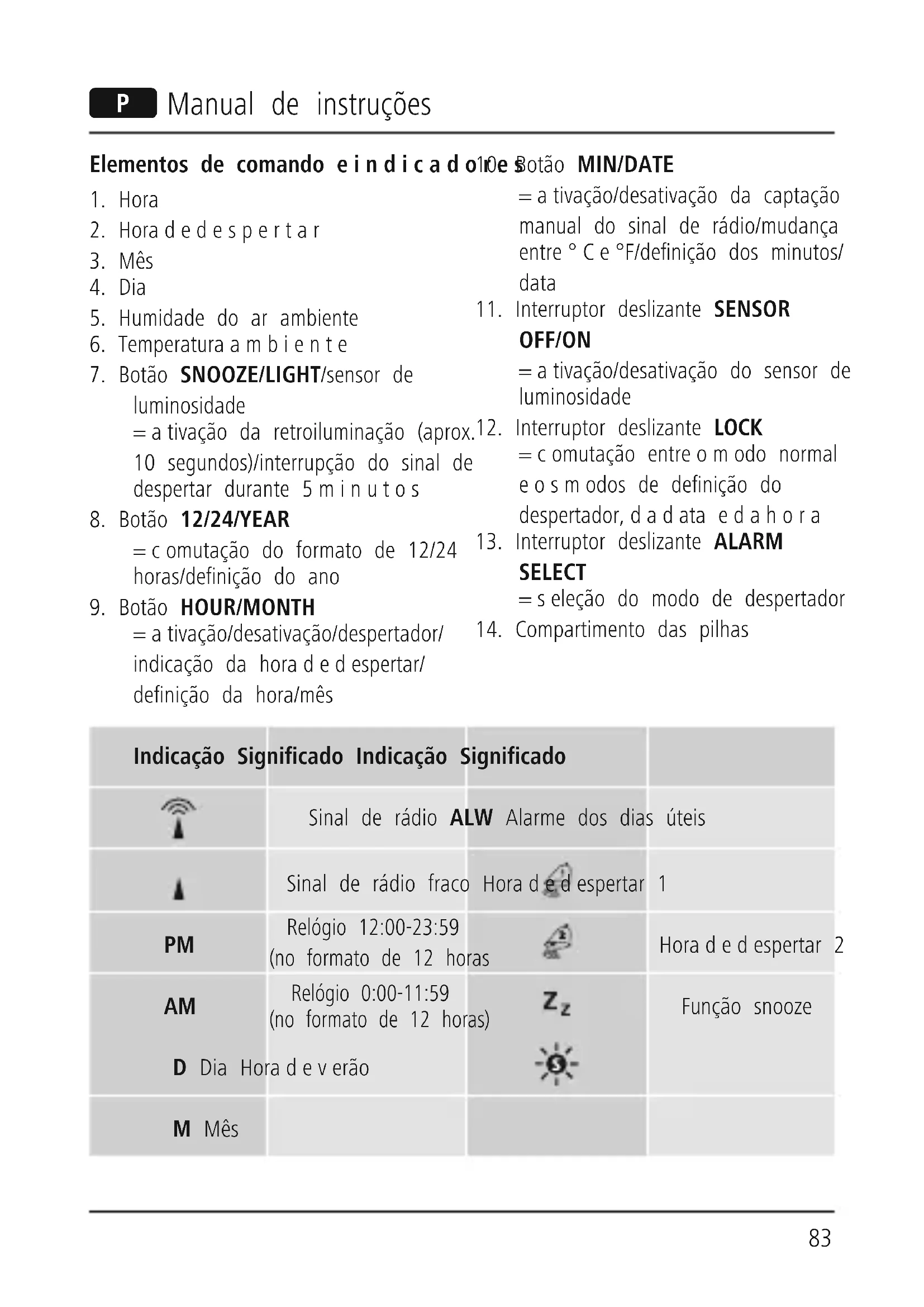 Indicação Significado Indicação Significado Sinal de rádio ALW Alarme dos dias úteis Sinal de rádio fraco Horadedespertar 1