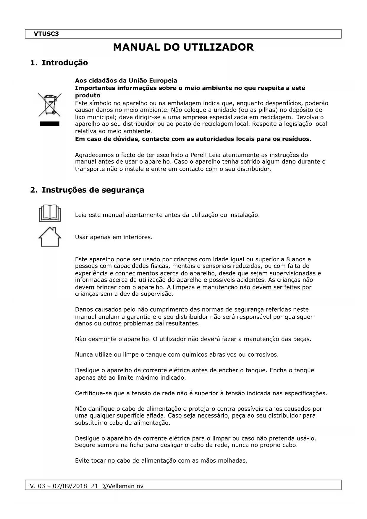 Encontre gratuitamente o manual do aparelho VTUSC3 Perel em formato PDF.
