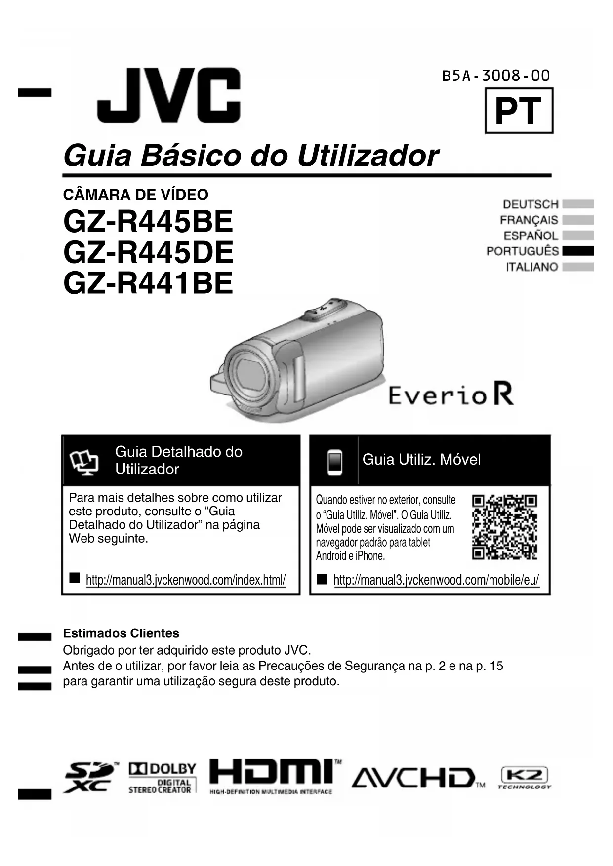 GZ-R445BE GZ-R445DE GZ-R441BE Estimados ClientesObrigado por ter adquirido este produto JVC.Antes de o utilizar, por favor leia as Precauções de Segurança na p. 2 e na p. 15para garantir uma utilização segura deste produto. B5A-3008-00