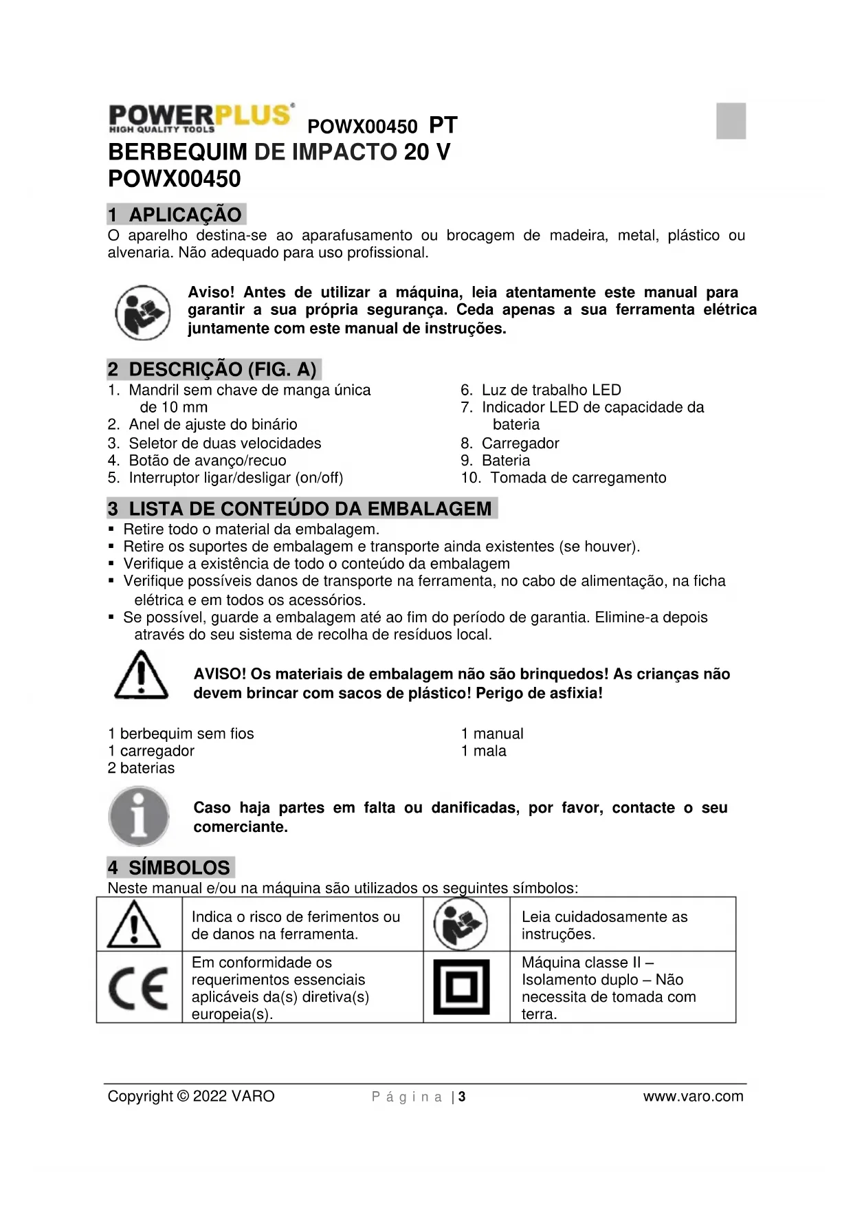 Máquina classe II – Isolamento duplo – Não necessita de tomada com terra.POWX00450 PT Copyright © 2022 VARO P á g i n a | 4 www.varo.com
