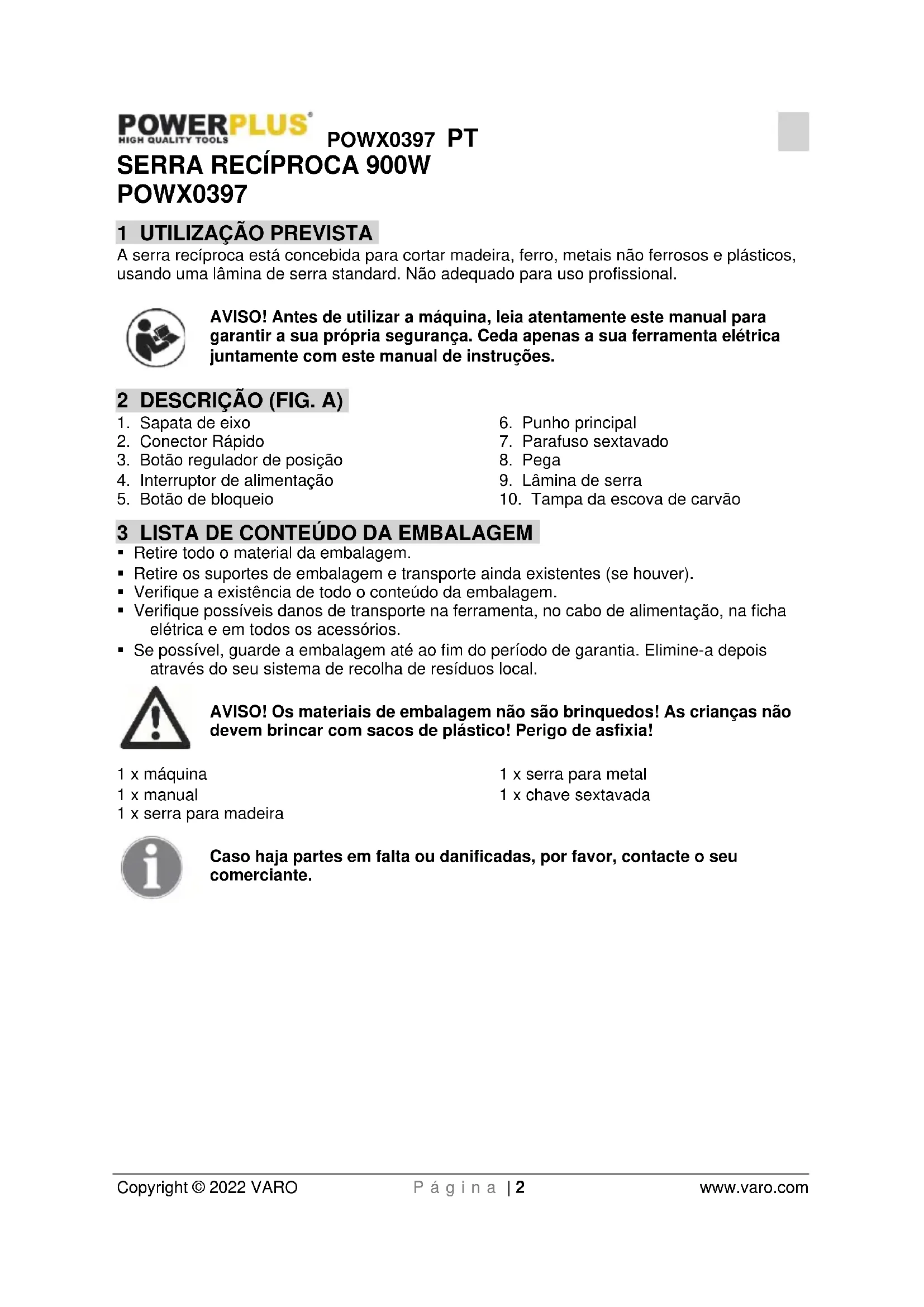 - Se possível, guarde a embalagem até ao fim do período de garantia. Elimine-a depois através do seu sistema de recolha de resíduos local. AVISO! Os materiais de embalagem não são brinquedos! As crianças não devem brincar com sacos de plástico! Perigo de asfixia! 1 x máquina 1 x manual 1 x serra para madeira 1 x serra para metal 1 x chave sextavada Caso haja partes em falta ou danificadas, por favor, contacte o seu comerciante.POWX0397 PT Copyright © 2022 VARO P á g i n a | 3 www.varo.com 4 SÍMBOLOS Neste manual e/ou na máquina são utilizados os seguintes símbolos: