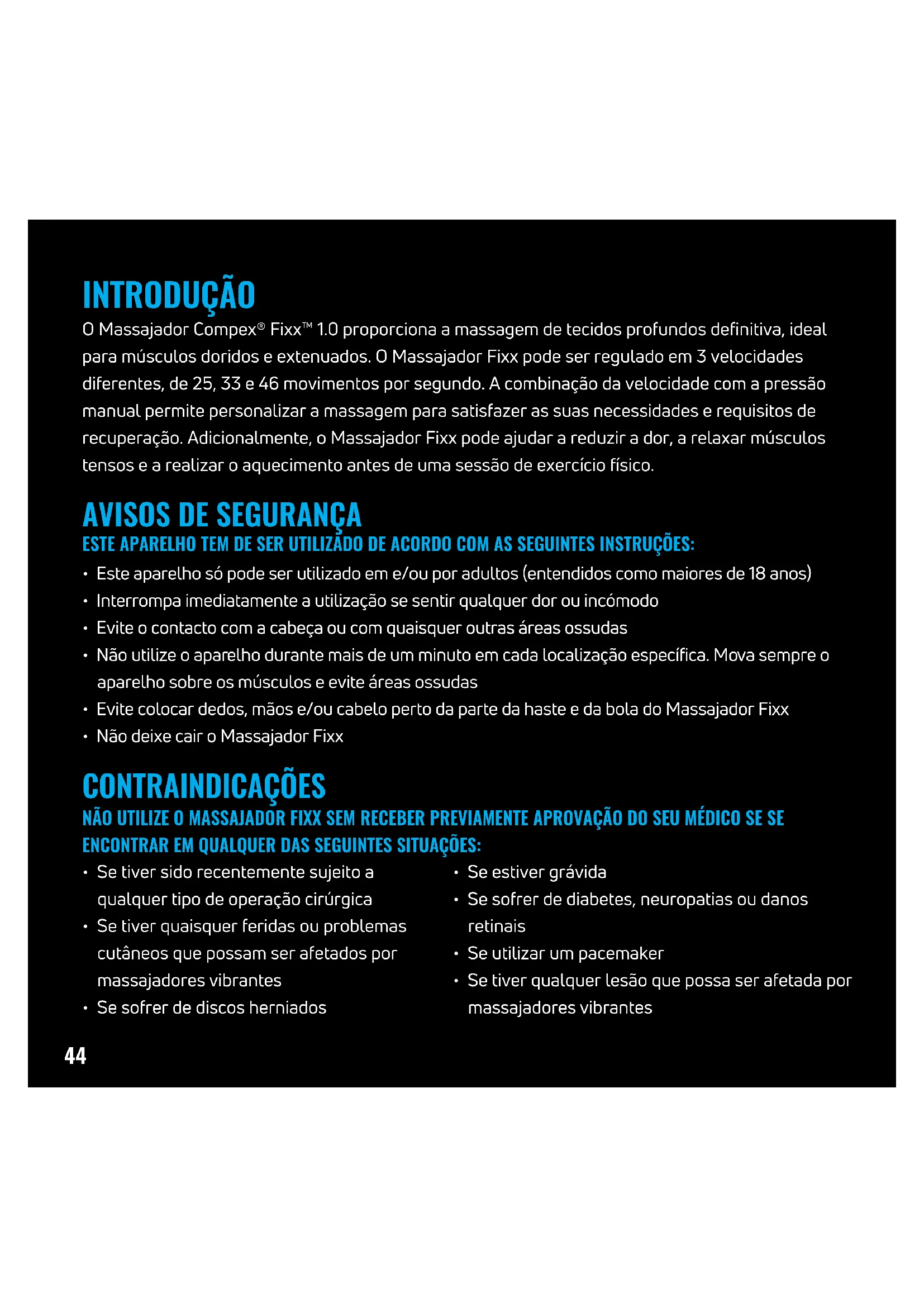 - Se tiver qualquer lesão que possa ser afetada por massajadores vibrantes NÃO UTILIZE O MASSAJADOR FIXX SEM RECEBER PREVIAMENTE APROVAÇÃO DO SEU MÉDICO SE SE ENCONTRAR EM QUALQUER DAS SEGUINTES SITUAÇÕES: CONTRAINDICAÇÕES45