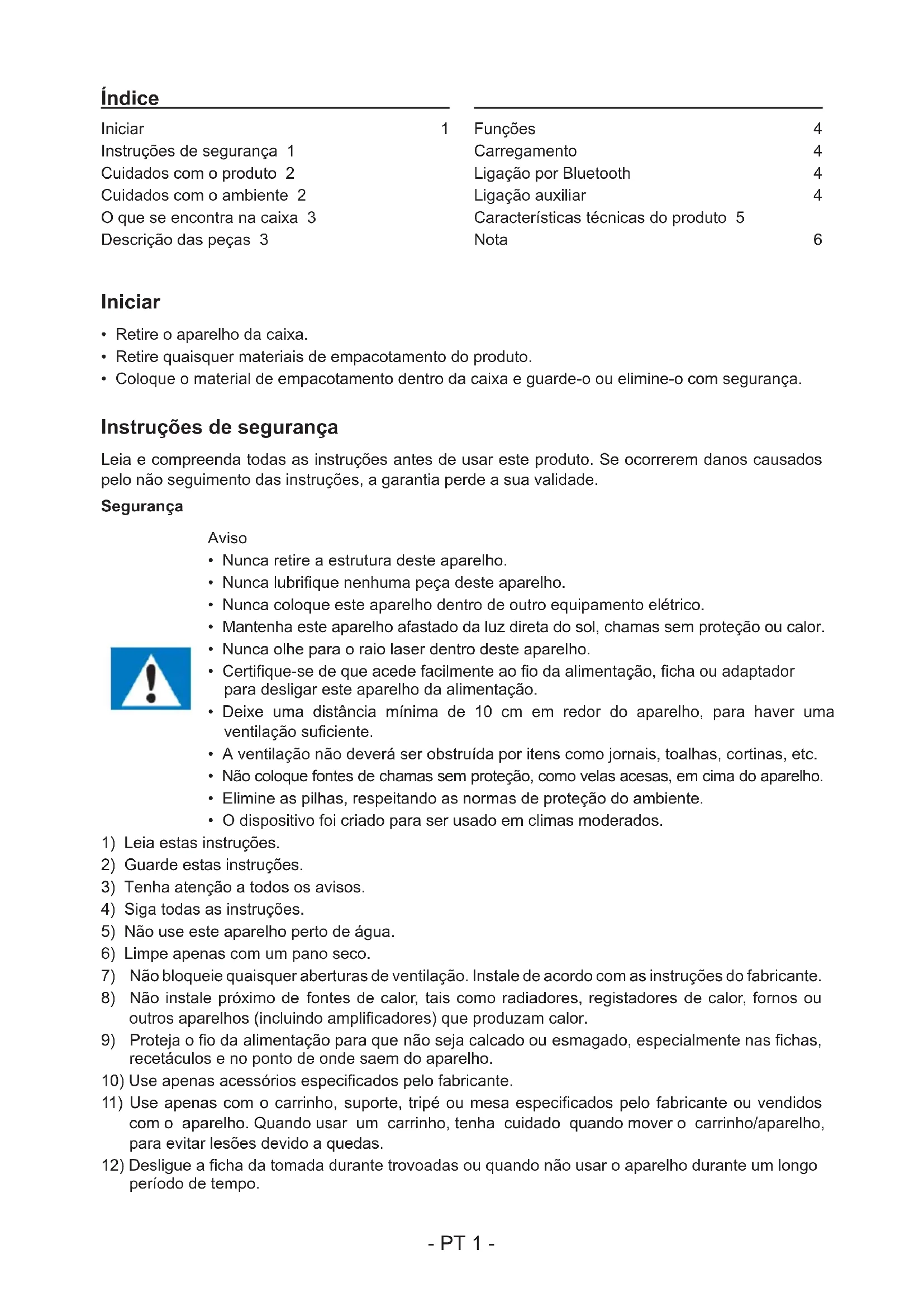 período de tempo. Iniciar 1 Instruções de segurança 1 Cuidados com o produto 2 Cuidados com o ambiente 2 O que se encontra na caixa 3 Descrição das peças 3 Funções: 4 Carregamento: 4 Ligação por Bluetooth: 4 Ligação auxiliar: 4 Características técnicas do produto 5 Nota: 6 Índice- PT 2 -
