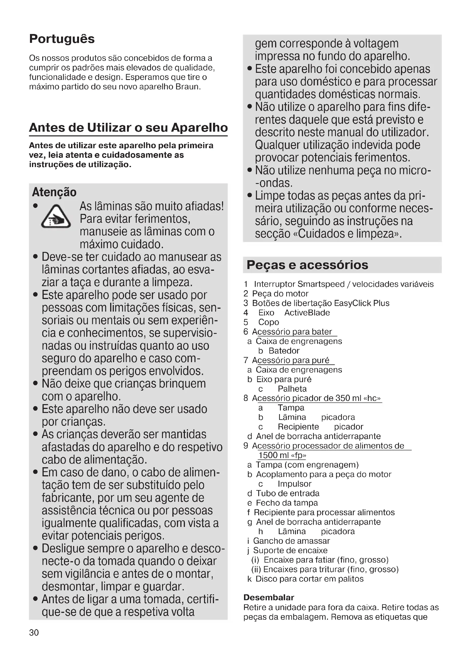 Limpe todas as peças antes da pri- meira utilização ou conforme neces- sário, seguindo as instruções na secção «Cuidados e limpeza». Peças e acessórios 1 Interruptor Smartspeed / velocidades variáveis 2 Peça do motor 3 Botões de libertação EasyClick Plus 4 Eixo ActiveBlade 5 Copo 6 Acessório para bater a Caixa de engrenagens b Batedor 7 Acessório para puré a Caixa de engrenagens b Eixo para puré c Palheta 8 Acessório picador de 350 ml «hc» a Tampa b Lâmina picadora c Recipiente picador d Anel de borracha antiderrapante 9 Acessório processador de alimentos de 1500 ml «fp» a Tampa (com engrenagem) b Acoplamento para a peça do motor c Impulsor d Tubo de entrada e Fecho da tampa f Recipiente para processar alimentos g Anel de borracha antiderrapante h Lâmina picadora i Gancho de amassar j Suporte de encaixe (i) Encaixe para fatiar (fino, grosso) (ii) Encaixes para triturar (fino, grosso) k Disco para cortar em palitos Desembalar Retire a unidade para fora da caixa. Retire todas as peças da embalagem. Remova as etiquetas que 5722113494_02_MQ7075x-7077x-7087x INT_S6-144.indd 305722113494_02_MQ7075x-7077x-7087x INT_S6-144.indd 30 12.07.19 08:1012.07.19 08:1031 possam existir na unidade (não remova a placa identificativa). Como utilizar o aparelho Interruptor Smartspeed para velocidades variáveis Um acionamento, todas as velocidades. Quanto mais pressionar, maior será a velocidade. Quanto maior for a velocidade, mais rápidos e finos serão os resultados de mistura e picagem. Operação com uma só mão: o interruptor Smartspeed (1) permite-lhe ligar o aparelho e controlar a velocidade com uma mão. Eixo ActiveBlade (A) A varinha mágica está equipada com um eixo ActiveBlade, que permite que a lâmina se estenda ao fundo do sino. O ajuste é realizado automatica- mente através da pressão necessária em tarefas de mistura, sendo especialmente adequado para misturar alimentos duros como, por exemplo, frutas e legumes crus. Também se adequa perfeitamente à preparação de pastas, molhos, molhos para salada, sopas, alimentos para bebés, assim como bebidas, smoothies e batidos de leite. Para obter os melhores resultados, use a veloci- dade mais alta. Montagem e operação