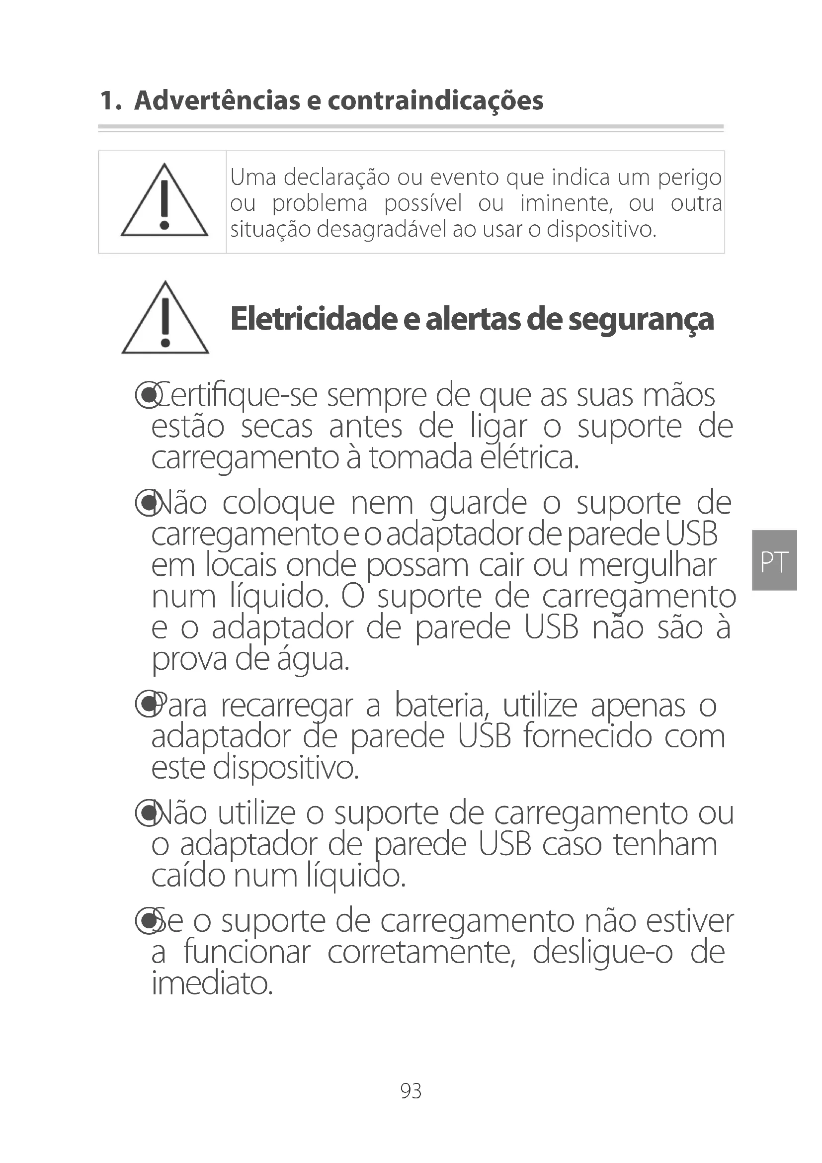 Não coloque nem guarde o suporte de corregamento e o adaptorde parede USB em locais ond possam cair ou mergulhar num liquido. O suporte de corregamento e o adaptordo de parede USB não são a prova de agua.