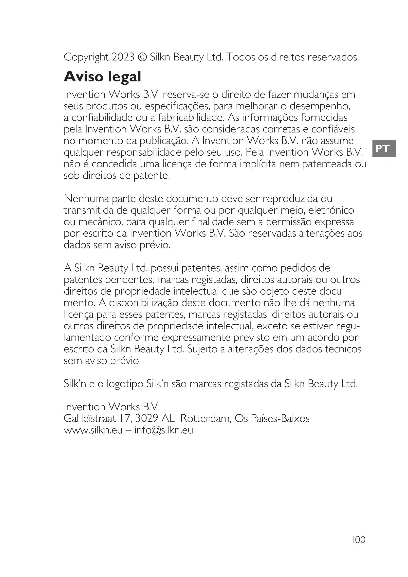 A Silkn Beauty Ltd. possui patentes, assim como pedidos de patentes pendentes, marcas registadas, direitos autorais ou outros direitos de propriedade intelectual que são objeto deste documento. A disponibilização deste documento não lhe dá nenhuma licença para esses patentes, marcas registadas, direitos autorais ou outros direitos de propriedade intelectual, exceto se estiver regulamentado conforme expressamente previsto em um acordo por escrito da Silkn Beauty Ltd. Sujeito a alterações dos dados técnicos sem aviso prévio.