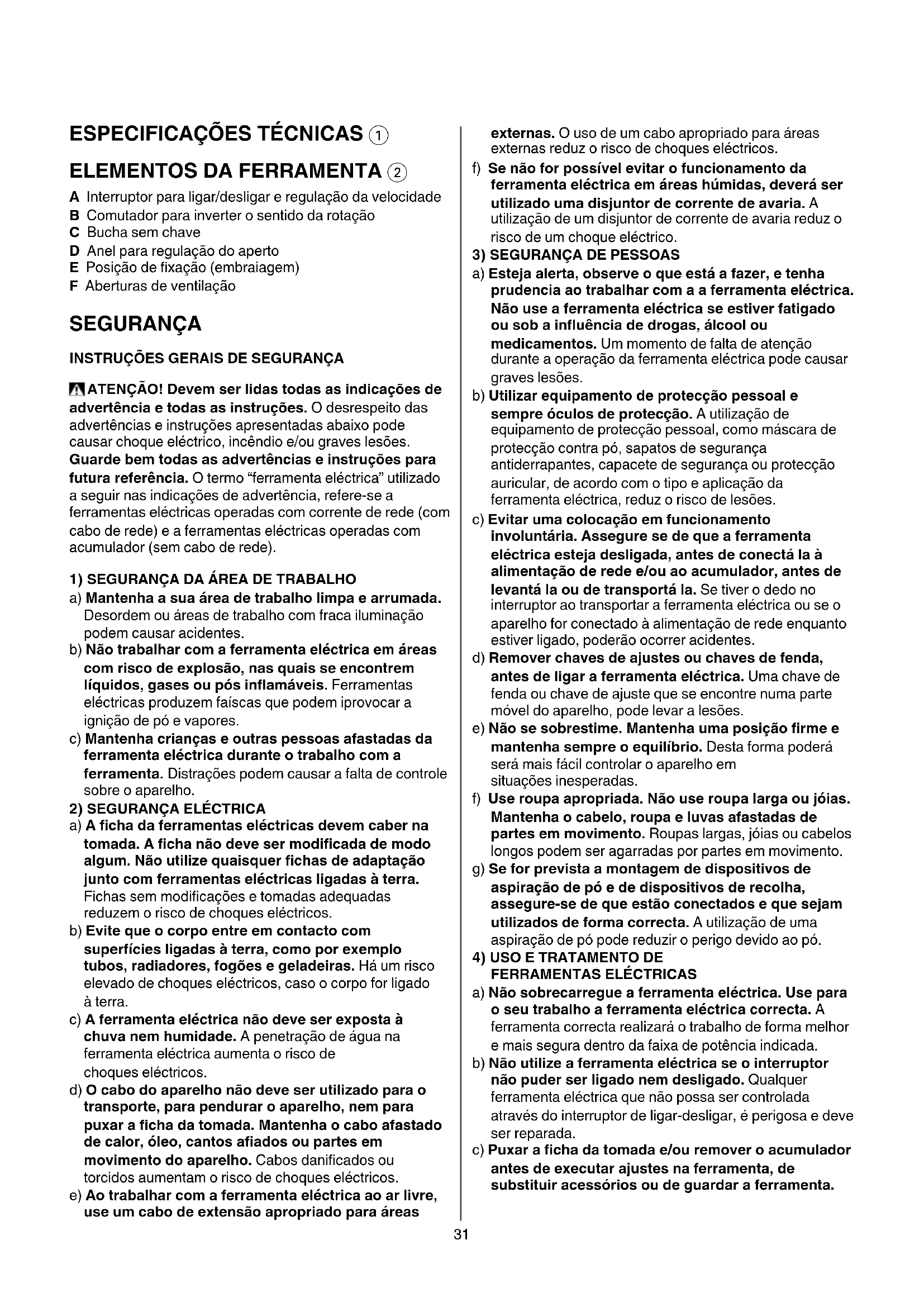 A Interruptor para ligar/desligar e regulação da velocidade B Comutador para inverter o sentido da rotação C Bucha sem chave D Anel para regulação do aperto E Posição de xação (embraiagem) F Aberturas de ventilação SEGURANÇA