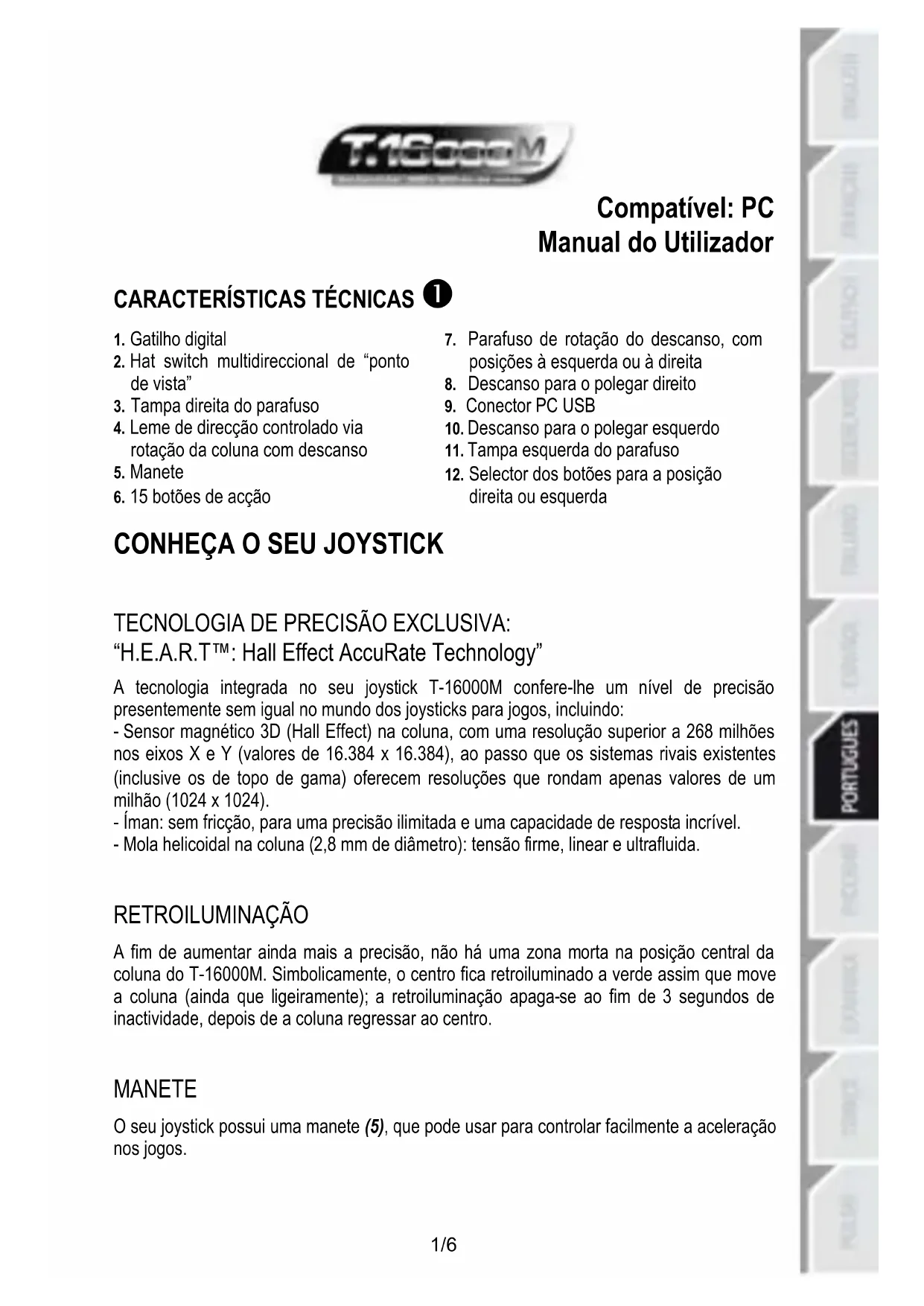 TECNOLOGIA DE PRECISÃO EXCLUSIVA: “H.E.A.R.T™: Hall Effect AccuRate Technology” A tecnologia integrada no seu joystick T-16000M confere-lhe um nível de precisão presentemente sem igual no mundo dos joysticks para jogos, incluindo: - Sensor magnético 3D (Hall Effect) na coluna, com uma resolução superior a 268 milhões nos eixos X e Y (valores de 16.384 x 16.384), ao passo que os sistemas rivais existentes (inclusive os de topo de gama) oferecem resoluções que rondam apenas valores de um milhão (1024 x 1024). - Íman: sem fricção, para uma precisão ilimitada e uma capacidade de resposta incrível. - Mola helicoidal na coluna (2,8 mm de diâmetro): tensão firme, linear e ultrafluida.