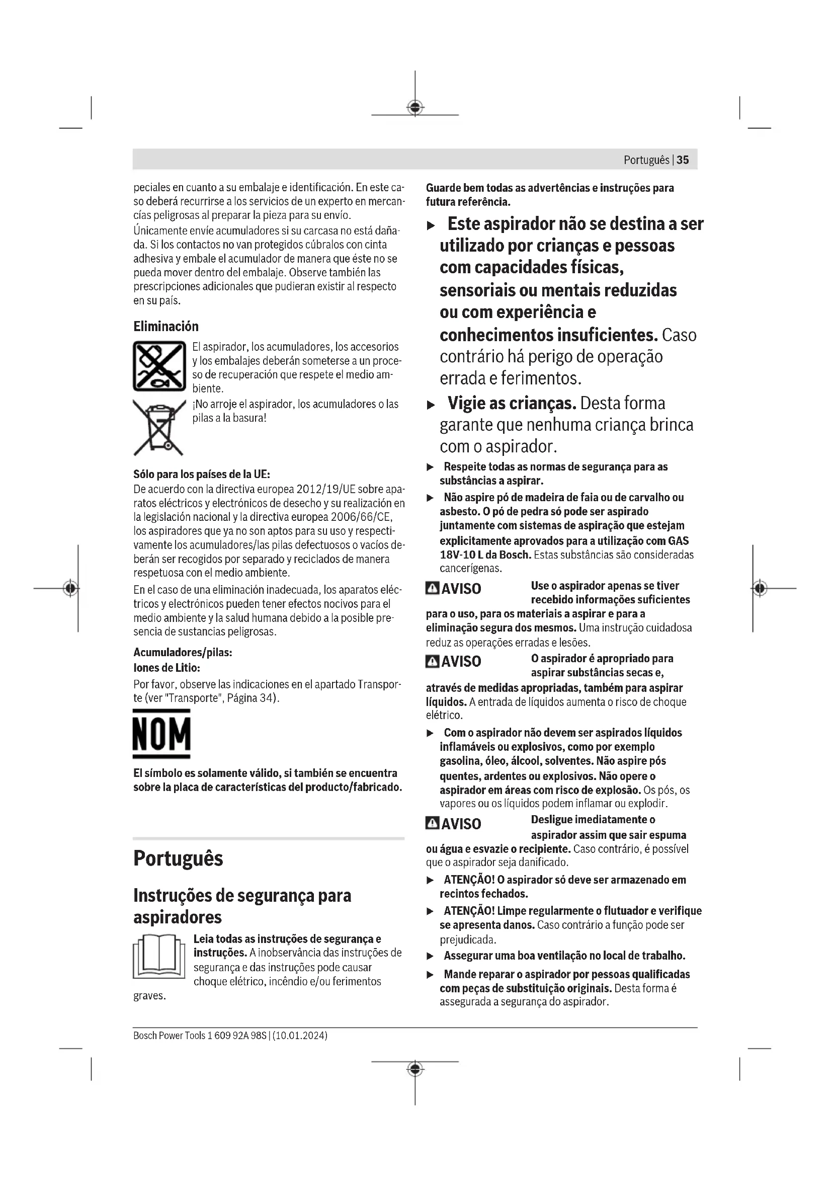 sustituya un filtro (33) dañado. – Coloque el filtro (33) sobre el soporte del filtro (35) y gí- relo hasta el tope en sentido de giro . – Coloque de nuevo la parte superior del aspirador (5) y asegure los cierres (2). Asegúrese, que los cierres encastren correctamente. Fallos Si la reducción de la potencia de aspiración fuese notable: – ¿Está lleno el depósito (1)? ▷(ver "Limpiar el depósito (ver figuras H1−H2)", Pági- na34). – ¿Está el filtro (33) lleno de polvo? ▷(ver "Limpiar/cambiar el filtro (ver figuras I1−I2)", Pági- na34). – ¿Es insuficiente la capacidad del acumulador? ▷Cargue el acumulador. El vaciado del depósito(1) y la limpieza del filtro(33) con regularidad, garantizan una potencia óptima de aspiración. Si luego no se logra el rendimiento de aspiración, recurra al servicio postventaBosch. Almacenaje (ver figura J) – Inserte los tubos de aspiración (18) en los soportes (25). – Coloque la boquilla para ranuras (16) en un tubo de aspi- ración (18). – Coloque la boquilla para suelo (17) en el soporte (27). – Enrolle la manguera de aspiración (13) desde abajo alre- dedor del soporte (27) y fije el lazo de sujeción (36). – Transporte el aspirador solamente por el asa (6) o la co- rrea para transporte (si existe). – Guarde el aspirador en una habitación seca y asegúralo contra el uso no autorizado. Servicio técnico y atención al cliente El servicio técnico le asesorará en las consultas que pueda Ud. tener sobre la reparación y mantenimiento de su produc- to, así como sobre piezas de recambio. Las representacio- nes gráficas tridimensionales e informaciones de repuestos se encuentran también bajo: www.bosch-pt.com El equipo asesor de aplicaciones de Bosch le ayuda gustosa- mente en caso de preguntas sobre nuestros productos y sus accesorios. Para cualquier consulta o pedido de piezas de repuesto es imprescindible indicar el nº de artículo de 10dígitos que fi- gura en la placa de características del producto. España Robert Bosch España S.L.U. Departamento de ventas Herramientas Eléctricas C/Hermanos García Noblejas, 19 28037 Madrid Para efectuar su pedido online de recambios o pedir la reco- gida para la reparación de su máquina, entre en la página www.herramientasbosch.net. Tel. Asesoramiento al cliente: 902 531 553 Fax: 902 531554 México Robert Bosch S. de R.L. de C.V. Calle Robert Bosch No. 405 C.P. 50071 Zona Industrial, Toluca - Estado de México Tel.: (52) 55 528430-62 Tel.: 800 6271286 www.boschherramientas.com.mx Direcciones de servicio adicionales se encuentran bajo: www.bosch-pt.com/serviceaddresses Transporte Los acumuladores de iones de litio recomendados están su- jetos a los requerimientos de la ley de mercancías peligro- sas. Los acumuladores pueden ser transportados por carre- tera por el usuario sin más imposiciones. En el envío por terceros (p.ej., transporte aéreo o por agen- cia de transportes) deberán considerarse las exigencias es- 1 609 92A 98S | (10.01.2024) Bosch Power ToolsPortuguês | 35 peciales en cuanto a su embalaje e identificación. En este ca- so deberá recurrirse a los servicios de un experto en mercan- cías peligrosas al preparar la pieza para su envío. Únicamente envíe acumuladores si su carcasa no está daña- da. Si los contactos no van protegidos cúbralos con cinta adhesiva y embale el acumulador de manera que éste no se pueda mover dentro del embalaje. Observe también las prescripciones adicionales que pudieran existir al respecto en su país. Eliminación El aspirador, los acumuladores, los accesorios y los embalajes deberán someterse a un proce- so de recuperación que respete el medio am- biente. ¡No arroje el aspirador, los acumuladores o las pilas a la basura! Sólo para los países de laUE: De acuerdo con la directiva europea 2012/19/UE sobre apa- ratos eléctricos y electrónicos de desecho y su realización en la legislación nacional y la directiva europea 2006/66/CE, los aspiradores que ya no son aptos para su uso y respecti- vamente los acumuladores/las pilas defectuosos o vacíos de- berán ser recogidos por separado y reciclados de manera respetuosa con el medio ambiente. En el caso de una eliminación inadecuada, los aparatos eléc- tricos y electrónicos pueden tener efectos nocivos para el medio ambiente y la salud humana debido a la posible pre- sencia de sustancias peligrosas. Acumuladores/pilas: Iones de Litio: Por favor, observe las indicaciones en el apartado Transpor- te (ver "Transporte", Página34). El símbolo es solamente válido, si también se encuentra sobre la placa de características del producto/fabricado. Português Instruções de segurança para aspiradores Leia todas as instruções de segurança e instruções. A inobservância das instruções de segurança e das instruções pode causar choque elétrico, incêndio e/ou ferimentos graves. Guarde bem todas as advertências e instruções para futura referência. u Este aspirador não se destina a ser utilizado por crianças e pessoas com capacidades físicas, sensoriais ou mentais reduzidas ou com experiência e conhecimentos insuficientes. Caso contrário há perigo de operação errada e ferimentos. u Vigie as crianças. Desta forma garante que nenhuma criança brinca com o aspirador. u Respeite todas as normas de segurança para as substâncias a aspirar. u Não aspire pó de madeira de faia ou de carvalho ou asbesto. O pó de pedra só pode ser aspirado juntamente com sistemas de aspiração que estejam explicitamente aprovados para a utilização comGAS 18V-10 L daBosch. Estas substâncias são consideradas cancerígenas. AVISO Use o aspirador apenas se tiver recebido informações suficientes para o uso, para os materiais a aspirar e para a eliminação segura dos mesmos. Uma instrução cuidadosa reduz as operações erradas e lesões. AVISO O aspirador é apropriado para aspirar substâncias secas e, através de medidas apropriadas, também para aspirar l