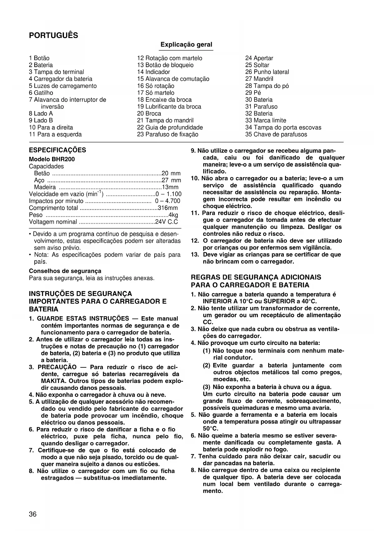Retire o pé quando não utilizar a bateria B2417. Ajudará a colocar a ferramenta bem assente. (Fig. 21) Instale o pé quando utiliza a bateria B2430. Ajudará a colocar a ferramenta bem assente. (Fig. 22) MANUTENÇÃO PRECAUÇÃO: Certifique-se sempre de que a ferramenta se encontra desligada e de que a bateria foi retirada antes de efec- tuar qualquer inspecção e manutenção. Substituição das escovas de carvão (Fig. 23e24) Retire e inspeccione regularmente as escovas de car- vão. Substitua-as quando estiverem gastas até à marca limite. Mantenha as escovas de carvão limpas e livres para deslizarem nos suportes. As duas escovas de car- vão devem ser substituídas ao mesmo tempo. Utilize só escovas de carvão idênticas. Utilize uma chave de parafusos para retirar as tampas do suporte das escovas. Retire as escovas de carvão usa- das, coloque as novas e prenda as tampas do suporte das escovas. Para manter a segurança e fiabilidade do produto, as reparações, manutenção e afinações deverão ser sem- pre efectuadas por um Centro de Assistência Oficial Makita. Diamêtro da broca (mm) Depósito do pó 5 6– 14,5 Depósito do pó 9 12– 1641 DANSK Illustrationsoversigt 1 Knap 2Akku 3 Terminaldæksel 4 Oplader 5 Ladelamper 6 Afbryder 7 Omdrejningsvælger 8 A side 9 B side 10 Med uret 11 Mod uret 12 Rotation med hammerboring 13 Låseknap 14 Viser 15 Funktionsvælger 16 Kun rotation 17 Kun hammerboring 18 Bitskaft 19 Bor- og mejselfedt 20 Bit 21 Borepatronkappe 22 Dybdeanslag 23 Tilspændingsskrue 24 Stram 25 Løsn 26 Sidegreb 27 Borepatron 28 Støvbeskyttelseskappe 29 Fod 30 Akku 31 Skrue 32 Akku 33 Slidmarkering 34 Kuldæksel 35 Skruetrækker SPECIFIKATIONER Model BHR200 Kapacitet Beton ................................................................ 20mm Stål .................................................................... 27mm Træ .................................................................... 13mm Omdrejninger (ubelastet) (min