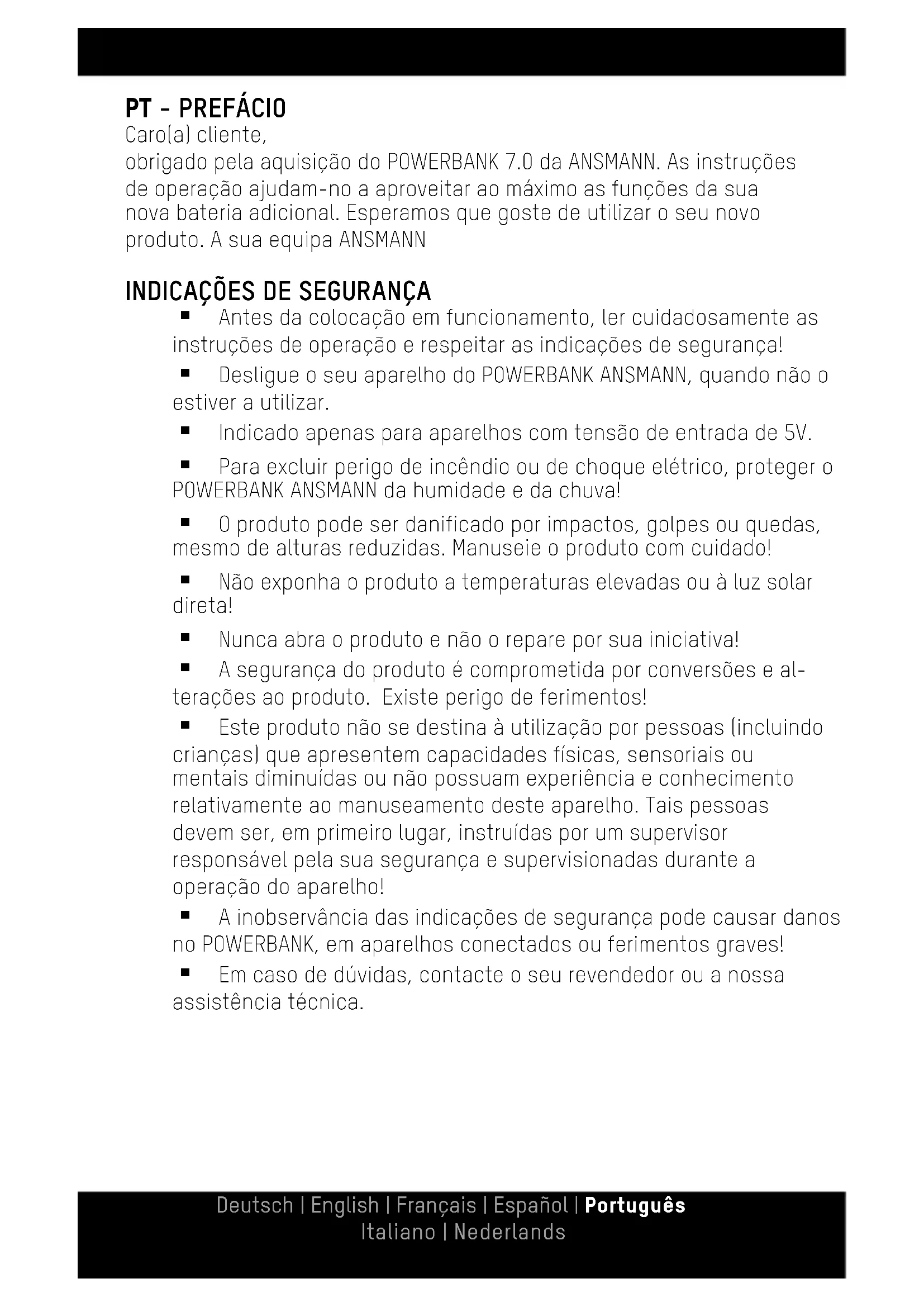 obrigado pela aquisicao do POWERBANK 7.0 da ANSMANN. As instruções de operacao ajudam-no aaproveitar ao maximo as funcaoes da sua nova bateria adicular. Esperamos que goste de utilizear o seu novo produits. A sua equipe ANSMANN