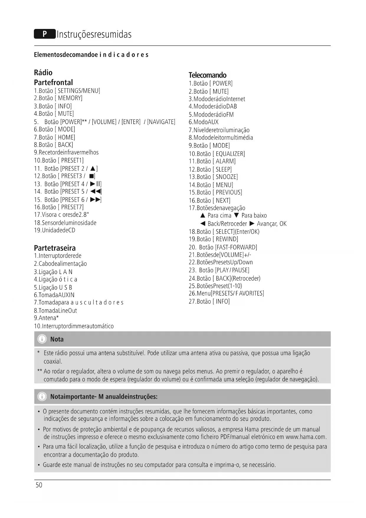 Nota *Este rádio possui uma antena substituível. Pode utilizar uma antena ativa ou passiva, que possua uma ligação coaxial. ** Ao rodar oregulador,alteraovolume de som ou navega pelos menus. Ao premir oregulador,oaparelho é comutado paraomodo de espera(regulador do volume) ou éconrmada uma seleção(regulador de navegação). Nota importante -Manual de instruções: