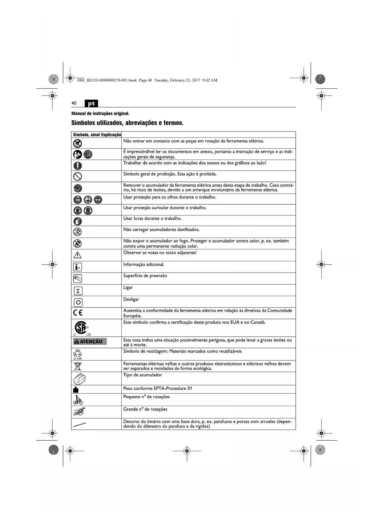 Manual de instruções original. Símbolos utilizados, abreviações e termos. Símbolo, sinal Explicação Não entrar em contacto com as peças em rotação da ferramenta elétrica. É imprescindível ler os documentos em anexo, portanto a instrução de serviço e as indi- cações gerais de segurança. Trabalhar de acordo com as indicações dos textos ou dos gráficos ao lado! Símbolo geral de proibição. Esta ação é proibida. Remover o acumulador da ferramenta elétrica antes desta etapa de trabalho. Caso contrá- rio, há risco de lesões, devido a um arranque involuntário da ferramenta elétrica. Usar proteção para os olhos durante o trabalho. Usar proteção auricular durante o trabalho. Usar luvas durante o trabalho. Não carregar acumuladores danificados. Não expor o acumulador ao fogo. Proteger o acumulador contra calor, p. ex. também contra uma permanente radiação solar. Observar as notas no texto adjacente! Informação adicional. Superfície de preensão Ligar Desligar Autentica a conformidade da ferramenta elétrica em relação às diretivas da Comunidade Européia. Este símbolo confirma a certificação deste produto nos EUA e no Canadá. Esta nota indica uma situação possivelmente perigosa, que pode levar a graves lesões ou até à morte. Símbolo de reciclagem: Materiais marcados como reutilizáveis Ferramentas elétricas velhas e outros produtos eletrotécnicos e elétricos velhos devem ser separados e reciclados de forma ecológica. Tipo de acumulador Peso conforme EPTA-Procedure 01 Pequeno n° de rotações Grande n° de rotações Decurso do binário com uma base dura, p. ex. parafusos e porcas com arruelas (depen- dendo do diâmetro do parafuso e da rigidez) OBJ_BUCH-0000000270-001.book Page 40 Tuesday, February 21, 2017 9:42 AM41