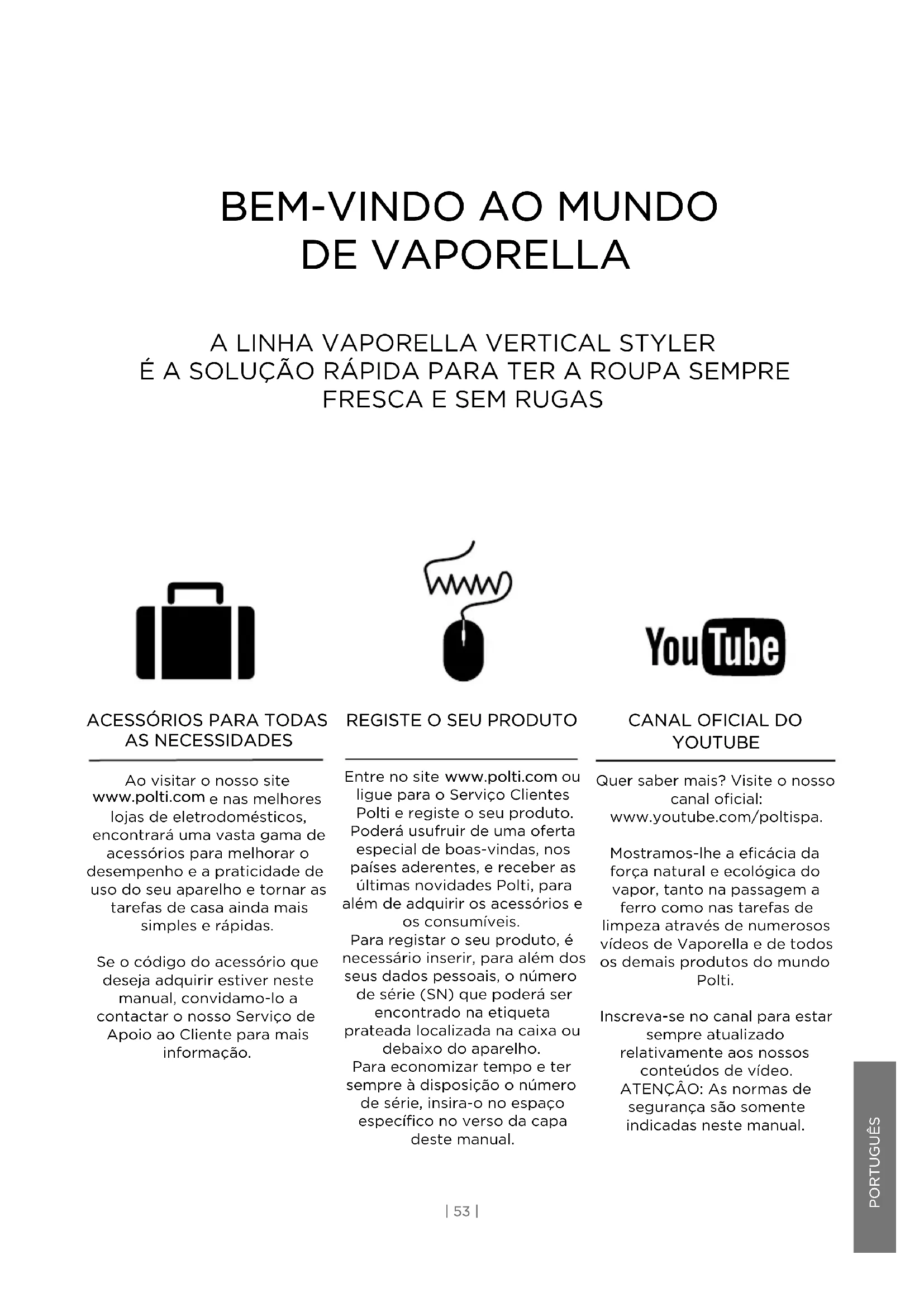 YOUTUBE Quer saber mais? Visite o nosso canal oficial: www.youtube.com/poltispa. Mostramos-lhe a eficácia da força natural e ecológica do vapor, tanto na passagem a ferro como nas tarefas de limpeza através de numerosos vídeos de Vaporella e de todos os demais produtos do mundo Polti. Inscreva-se no canal para estar sempre atualizado relativamente aos nossos conteúdos de vídeo. ATENÇÂO: As normas de segurança são somente indicadas neste manual.ADVERTÊNCIAS DE SEGURANÇA