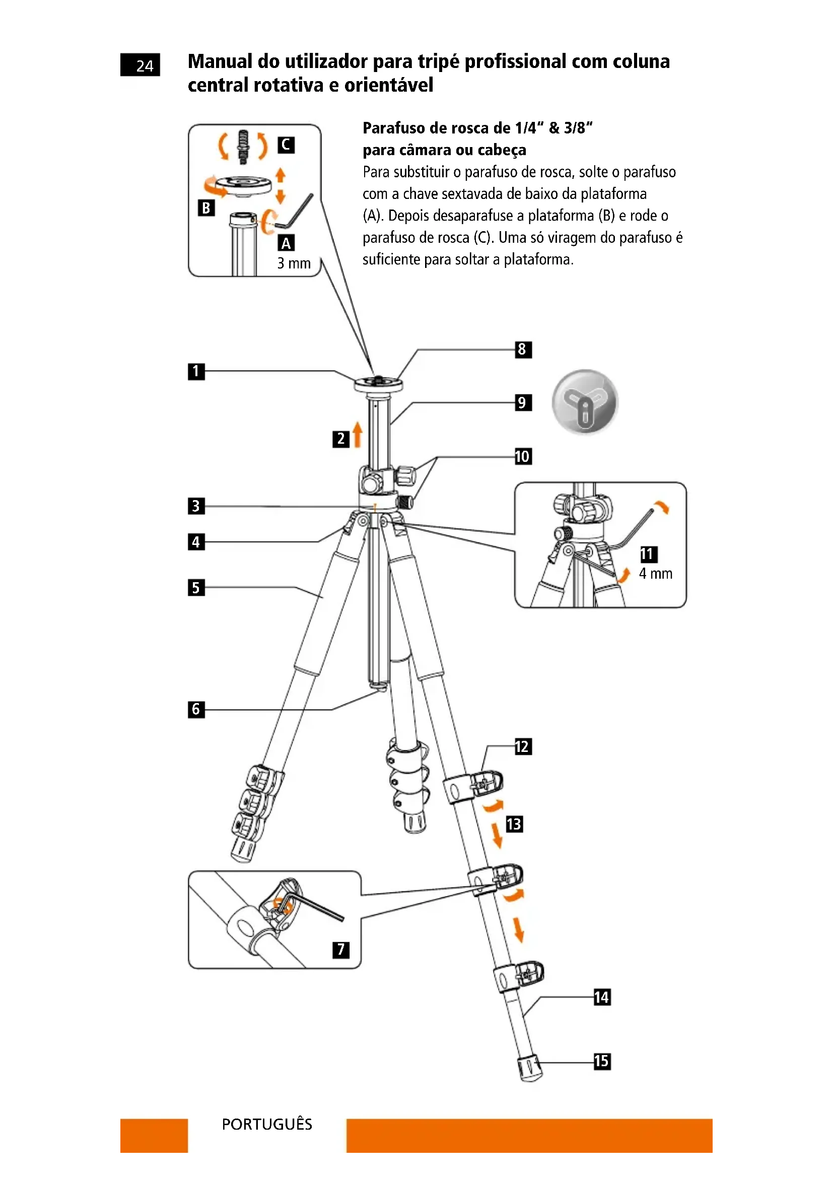 Parafuso de rosca de 1/4“ & 3/8“ para câmara ou cabeça Para substituir o parafuso de rosca, solte o parafuso com a chave sextavada de baixo da plataforma (A). Depois desaparafuse a plataforma (B) e rode o parafuso de rosca (C). Uma só viragem do parafuso é suficiente para soltar a plataforma. Manual do utilizador para tripé profissional com coluna central rotativa e orientável PORTUGUÊS25