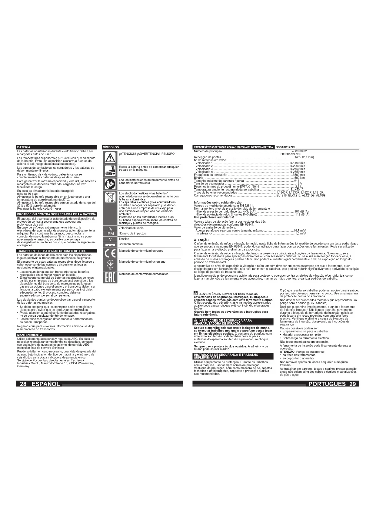 - Não transporte baterias danifi cadas ou que tenham fuga. Para instruções mais detalhadas consulte a companhia de transportes MANUTENÇÃO Utilizar apenas acessórios AEG e peças sobresselentes AEG. Os componentes cuja substituição não esteja descrita devem ser substituídos num serviço de assistência técnica AEG (consultar a brochura relativa à garantia/moradas dos serviços de assistência técnica). Se for necessário, um desenho de explosão do aparelho pode ser solicitado do seu posto de assistência ao cliente ou directamente da Techtronic Industries GmbH, Max-Eyth-Straße 10, 71364 Winnenden, Alemanha, indicando o tipo da máquina e o número de seis posições na chapa indicadora da potência. SYMBOLE ATENÇÃO! PERIGO! Antes de efectuar qualquer intervenção na máquina retirar o bloco acumulador. Leia atentamente o manual de instruções antes de colocar a máquina em funcionamento. Aparelhos eléctricos, baterias/acumuladores não devem ser jogados no lixo doméstico. Os aparelhos eléctricos e as baterias devem ser colectados separadamente e entregues a uma empresa de reciclagem para a eliminação correcta. Solicite informações sobre empresas de reciclagem e postos de colecta de lixo das autoridades locais ou do seu vendedor autorizado.