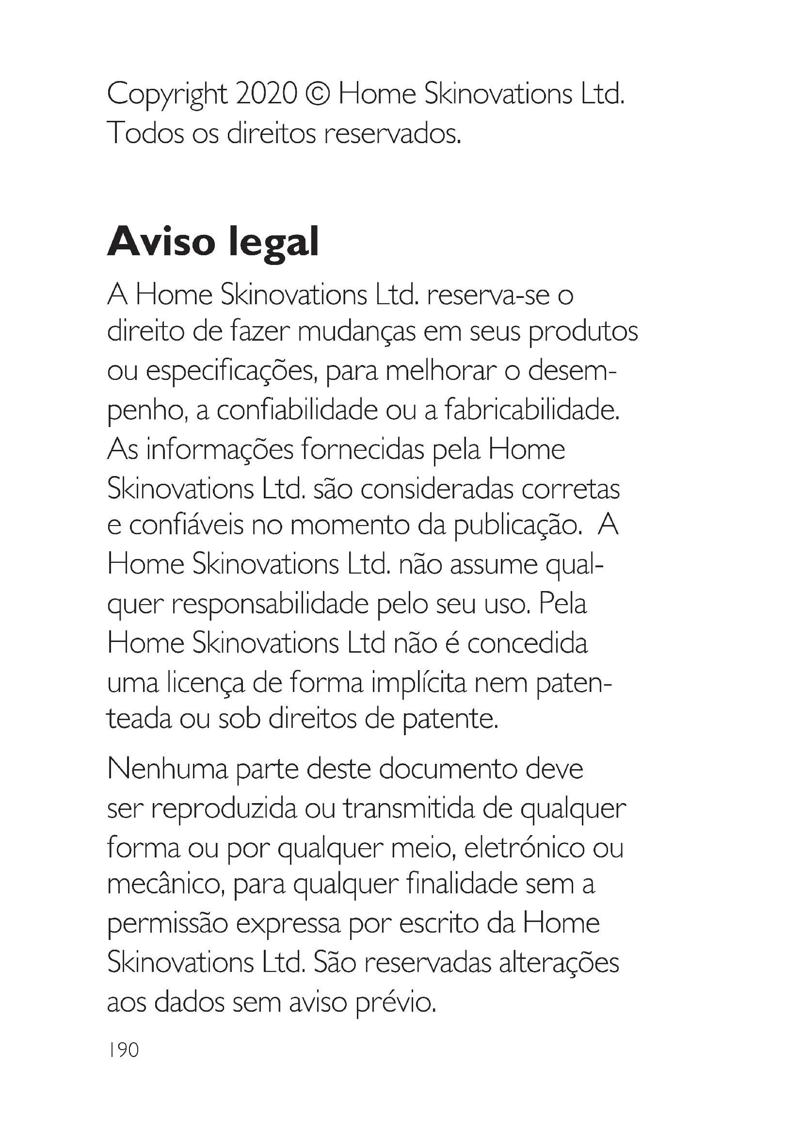 Nenhuma parte deste documento deve ser reproduzida ou transmitida de qualquer forma ou por qualquer meio, eletrônico ou mecâncico, para qualquer finalidade sem a permissão expressa por escrito da Home Skinovations Ltd. São reservadas alterações aos dados sem avis prévio.