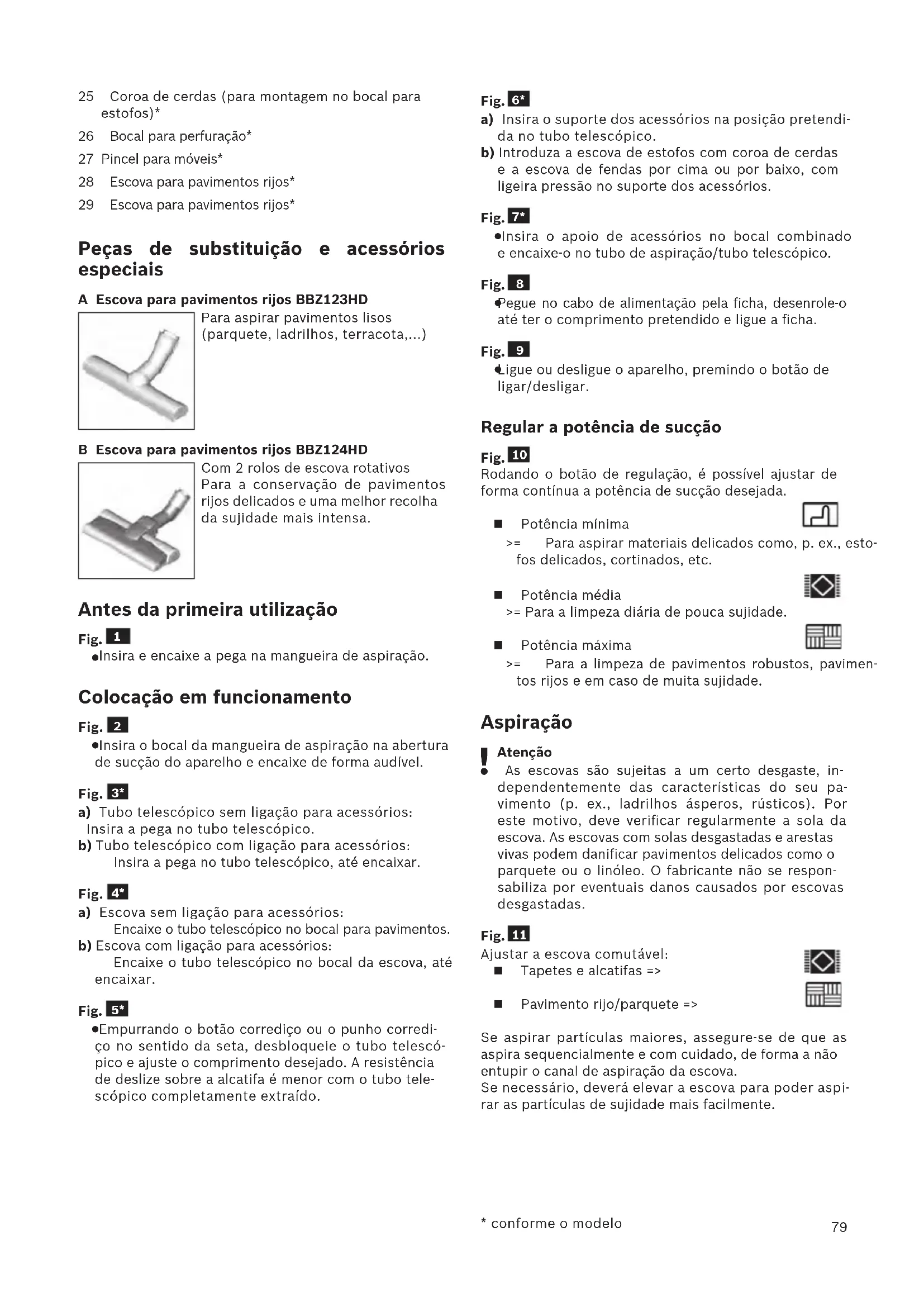 - conforme o modelo 25 Coroa de cerdas (para montagem no bocal para estofos)* 26 Bocal para perfuração* 27 Pincel para móveis* 28 Escova para pavimentos rijos* 29 Escova para pavimentos rijos* Peças de substituição e acessórios especiais A Escova para pavimentos rijos BBZ123HD Para aspirar pavimentos lisos (parquete, ladrilhos, terracota,...) B Escova para pavimentos rijos BBZ124HD