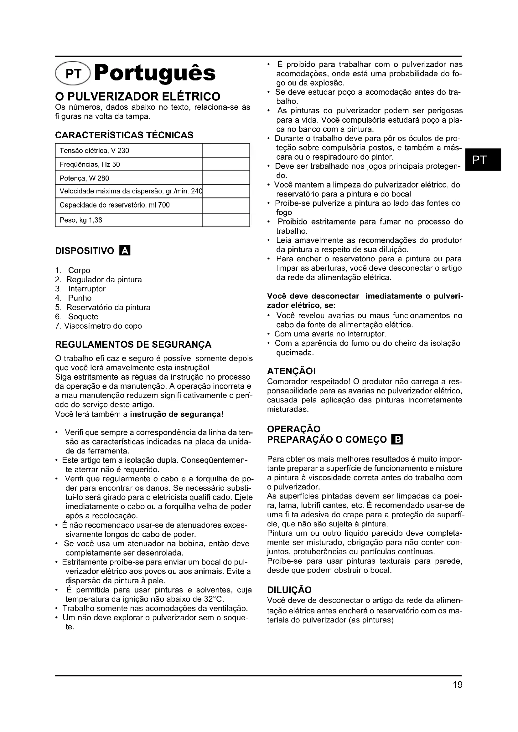 - Com a aparência do fumo ou do cheiro da isolação queimada. ATENÇÃO! Comprador respeitado! O produtor não carrega a res- ponsabilidade para as avarias no pulverizador elétrico, causada pela aplicação das pinturas incorretamente misturadas. OPERAÇÃO