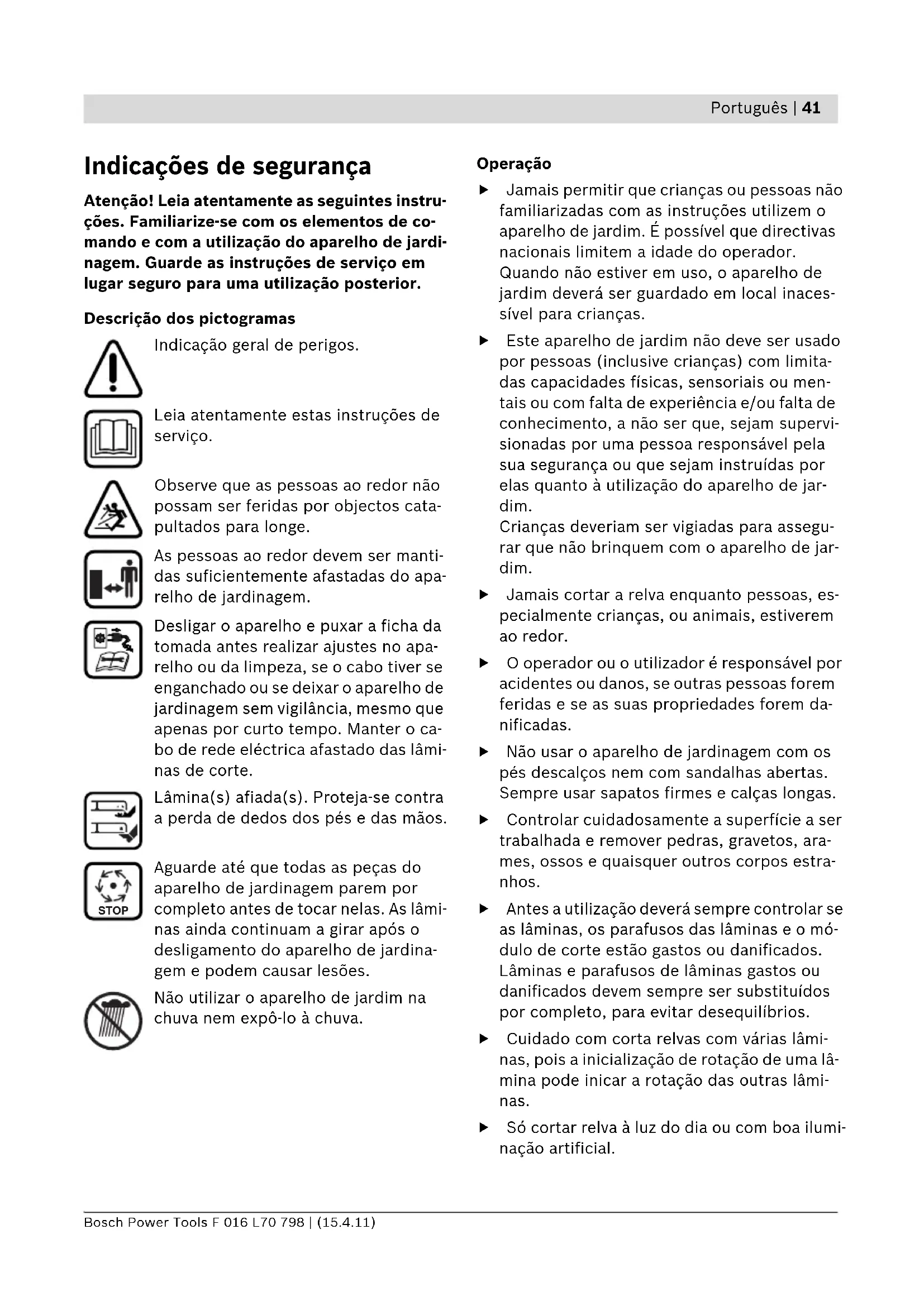 Indicações de segurança Atenção! Leia atentamente as seguintes instru- ções. Familiarize-se com os elementos de co- mando e com a utilização do aparelho de jardi- nagem. Guarde as instruções de serviço em lugar seguro para uma utilização posterior. Descrição dos pictogramas Indicação geral de perigos. Leia atentamente estas instruções de serviço. Observe que as pessoas ao redor não possam ser feridas por objectos cata- pultados para longe. As pessoas ao redor devem ser manti- das suficientemente afastadas do apa- relho de jardinagem. Desligar o aparelho e puxar a ficha da tomada antes realizar ajustes no apa- relho ou da limpeza, se o cabo tiver se enganchado ou se deixar o aparelho de jardinagem sem vigilância, mesmo que apenas por curto tempo. Manter o ca- bo de rede eléctrica afastado das lâmi- nas de corte. Lâmina(s) afiada(s). Proteja-se contra a perda de dedos dos pés e das mãos. Aguarde até que todas as peças do aparelho de jardinagem parem por completo antes de tocar nelas. As lâmi- nas ainda continuam a girar após o desligamento do aparelho de jardina- gem e podem causar lesões. Não utilizar o aparelho de jardim na chuva nem expô-lo à chuva. Operação f Jamais permitir que crianças ou pessoas não familiarizadas com as instruções utilizem o aparelho de jardim. É possível que directivas nacionais limitem a idade do operador. Quando não estiver em uso, o aparelho de jardim deverá ser guardado em local inaces- sível para crianças. f Este aparelho de jardim não deve ser usado por pessoas (inclusive crianças) com limita- das capacidades físicas, sensoriais ou men- tais ou com falta de experiência e/ou falta de conhecimento, a não ser que, sejam supervi- sionadas por uma pessoa responsável pela sua segurança ou que sejam instruídas por elas quanto à utilização do aparelho de jar- dim. Crianças deveriam ser vigiadas para assegu- rar que não brinquem com o aparelho de jar- dim. f Jamais cortar a relva enquanto pessoas, es- pecialmente crianças, ou animais, estiverem ao redor. f O operador ou o utilizador é responsável por acidentes ou danos, se outras pessoas forem feridas e se as suas propriedades forem da- nificadas. f Não usar o aparelho de jardinagem com os pés descalços nem com sandalhas abertas. Sempre usar sapatos firmes e calças longas. f Controlar cuidadosamente a superfície a ser trabalhada e remover pedras, gravetos, ara- mes, ossos e quaisquer outros corpos estra- nhos. f Antes a utilização deverá sempre controlar se as lâminas, os parafusos das lâminas e o mó- dulo de corte estão gastos ou danificados. Lâminas e parafusos de lâminas gastos ou danificados devem sempre ser substituídos por completo, para evitar desequilíbrios. f Cuidado com corta relvas com várias lâmi- nas, pois a inicialização de rotação de uma lâ- mina pode inicar a rotação das outras lâmi- nas. f Só cortar relva à luz do dia ou com boa ilumi- nação artificial. STOP OBJ_BUCH-1393-001.book Page 41 Friday, April 15, 2011 10:36 AM42 | Português F 016 L70 798 | (15.4.11) Bosch Power Tools f Se possível não deverá operar o aparelo de jardinagem com a relva molhada. f Sempre andar com calma, jamais andar com rapidez. f O trabalho em taludes pode ser perigoso. – Não cortar a relva em locais extremamen- te inclinados. – Ao trabalhar em superfícies inclinadas ou sobre relva molhada deverá sempre andar com cuidado. – Em superfícies inclinadas, a relva deverá sempre ser cortada transversalmente à in- clinação, jamais na direcção da inclina- ção. – Ao mudar de direcção em declives deverá sempre tomar muito cuidado. – Ao andar para trás ou ao puxar o aparelho de jardinagem deverá proceder com mui- to cuidado. – Ao cortar a relva deverá sempre empurrar o aparelho de jardinagem para frente e ja- mais puxá-lo na direcção do corpo. f As lâminas devem estar paradas se tiver que inclinar o aparelho de jardinagem para o transporte, se tiver que passar por superfíci- es sem relva e se tiver que transportar o apa- relho de jardinagem de ou para a área onde a relva deverá ser cortada. f Não inclinar o aparelh de jardinagem ao ligá- lo nem ao dar partida no motor, a não ser que isto seja necessário para a partida em relva alta. Neste caso deverá elevar o lado afasta- do do operador, premindo o punho para bai- xo, no entanto não mais do que estritamente necessário. Observe que as suas mãos se en- contrem no punho ao abaixar novamente o aparelho de jardinagem. f Desligar o aparelho de jardinagem como des- crito nas instruções de serviço e observe que os seus pés estejam numa distância suficien- te das peças em rotação. f Não permita que as suas mãos e os seus pés se encontrem perto nem sob as partes em ro- tação. f Manter-se afastado da zona de expulsão ao trabalhar com o aparelho de jardinagem. f Jamais levantar e transportar o aparelho de jardinagem com o motor ligado. f Jamais operar o aparelho de jardinagem se os dispositivos de protecção e coberturas es- tiverem defeituosos ou se os dispositivos de segurança, como por exemplo a protecção contra colisão e/ou o cesto de recolha da rel- va, não estiverem montados. f Tenha o maior cuidado ao realizar ajustes no corta relvas, para evitar que mãos e pés se- jam entalados entre as lâminas móveis e as partes fixas do corta relvas. f Manter o cabo de corrente eléctrica e o ca- bo de extensão afastados das lâminas. As lâminas podem danificar o cabo de modo que o operador possa entrar em contacto com as peças sob tensão. Cuidado, há perigo de um choque eléctrico. Puxar a ficha da tomada de corrente: – sempre que se afastar do aparelho de jardim, – antes de eliminar bloqueios, – ao controlar e limpar o aparelho de jardim ou antes de trabalhar nele, – após a colisão com um corpo estranho. Con- trolar imediatamente se o aparelho de jardim apresenta danos e, se necessário, permita que seja reparado, – se o a