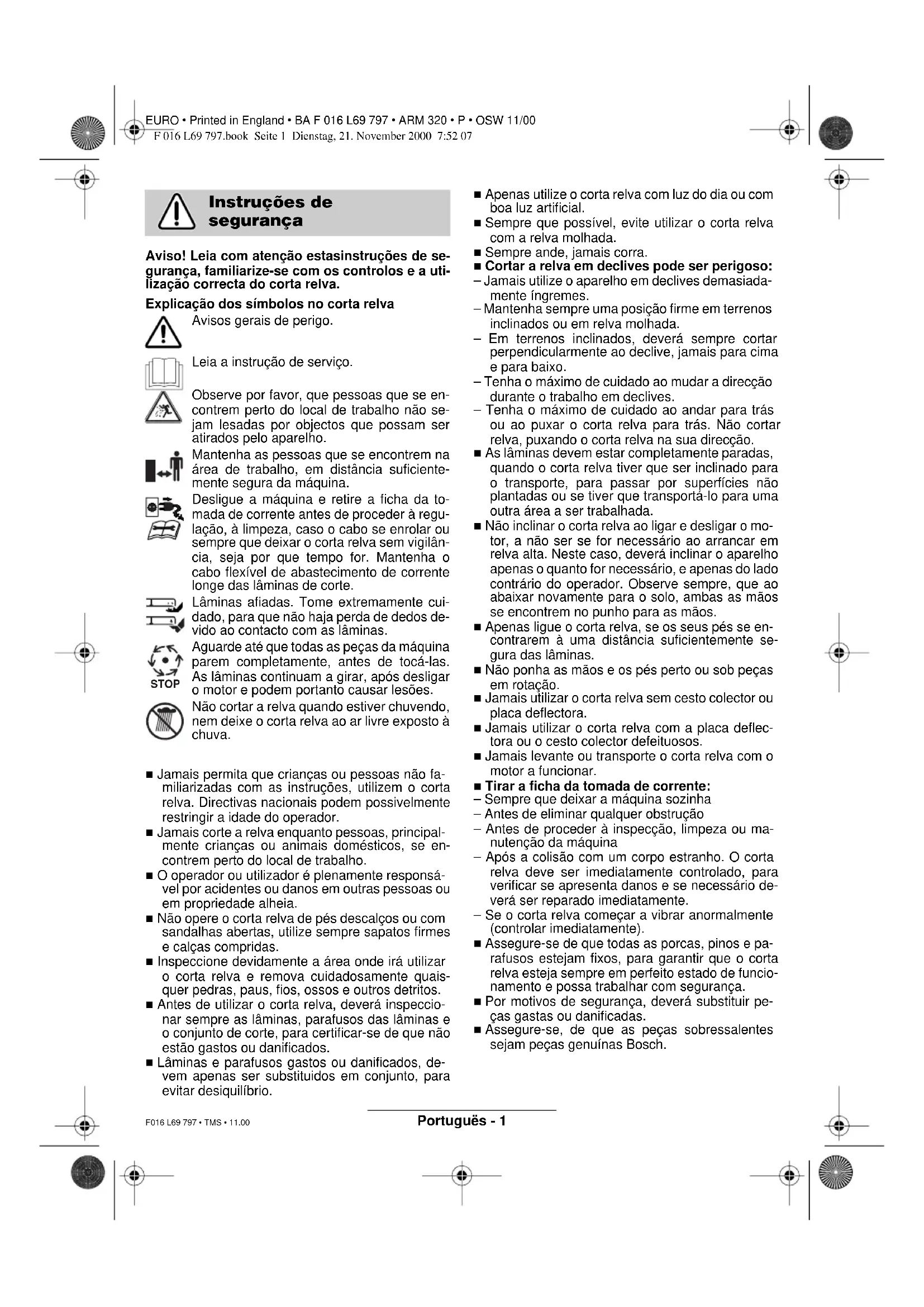Aviso! Leia com atenção estasinstruções de se- gurança, familiarize-se com os controlos e a uti- lização correcta do corta relva. Explicação dos símbolos no corta relva Avisos gerais de perigo. Leia a instrução de serviço. Observe por favor, que pessoas que se en- contrem perto do local de trabalho não se- jam lesadas por objectos que possam ser atirados pelo aparelho. Mantenha as pessoas que se encontrem na área de trabalho, em distância suficiente- mente segura da máquina. Desligue a máquina e retire a ficha da to- mada de corrente antes de proceder à regu- lação, à limpeza, caso o cabo se enrolar ou sempre que deixar o corta relva sem vigilân- cia, seja por que tempo for. Mantenha o cabo flexível de abastecimento de corrente longe das lâminas de corte. Lâminas afiadas. Tome extremamente cui- dado, para que não haja perda de dedos de- vido ao contacto com as lâminas. Aguarde até que todas as peças da máquina parem completamente, antes de tocá-las. As lâminas continuam a girar, após desligar o motor e podem portanto causar lesões. Não cortar a relva quando estiver chuvendo, nem deixe o corta relva ao ar livre exposto à chuva. ■ Jamais permita que crianças ou pessoas não fa- miliarizadas com as instruções, utilizem o corta relva. Directivas nacionais podem possivelmente restringir a idade do operador. ■ Jamais corte a relva enquanto pessoas, principal- mente crianças ou animais domésticos, se en- contrem perto do local de trabalho. ■ O operador ou utilizador é plenamente responsá- vel por acidentes ou danos em outras pessoas ou em propriedade alheia. ■ Não opere o corta relva de pés descalços ou com sandalhas abertas, utilize sempre sapatos firmes e calças compridas. ■ Inspeccione devidamente a área onde irá utilizar o corta relva e remova cuidadosamente quais- quer pedras, paus, fios, ossos e outros detritos. ■ Antes de utilizar o corta relva, deverá inspeccio- nar sempre as lâminas, parafusos das lâminas e o conjunto de corte, para certificar-se de que não estão gastos ou danificados. ■ Lâminas e parafusos gastos ou danificados, de- vem apenas ser substituidos em conjunto, para evitar desiquilíbrio. ■ Apenas utilize o corta relva com luz do dia ou com boa luz artificial. ■ Sempre que possível, evite utilizar o corta relva com a relva molhada. ■ Sempre ande, jamais corra. ■ Cortar a relva em declives pode ser perigoso: – Jamais utilize o aparelho em declives demasiada- mente íngremes. – Mantenha sempre uma posição firme em terrenos inclinados ou em relva molhada. – Em terrenos inclinados, deverá sempre cortar perpendicularmente ao declive, jamais para cima e para baixo. – Tenha o máximo de cuidado ao mudar a direcção durante o trabalho em declives. – Tenha o máximo de cuidado ao andar para trás ou ao puxar o corta relva para trás. Não cortar relva, puxando o corta relva na sua direcção. ■ As lâminas devem estar completamente paradas, quando o corta relva tiver que ser inclinado para o transporte, para passar por superfícies não plantadas ou se tiver que transportá-lo para uma outra área a ser trabalhada. ■ Não inclinar o corta relva ao ligar e desligar o mo- tor, a não ser se for necessário ao arrancar em relva alta. Neste caso, deverá inclinar o aparelho apenas o quanto for necessário, e apenas do lado contrário do operador. Observe sempre, que ao abaixar novamente para o solo, ambas as mãos se encontrem no punho para as mãos. ■ Apenas ligue o corta relva, se os seus pés se en- contrarem à uma distância suficientemente se- gura das lâminas. ■ Não ponha as mãos e os pés perto ou sob peças em rotação. ■ Jamais utilizar o corta relva sem cesto colector ou placa deflectora. ■ Jamais utilizar o corta relva com a placa deflec- tora ou o cesto colector defeituosos. ■ Jamais levante ou transporte o corta relva com o motor a funcionar. ■ Tirar a ficha da tomada de corrente: – Sempre que deixar a máquina sozinha – Antes de eliminar qualquer obstrução – Antes de proceder à inspecção, limpeza ou ma- nutenção da máquina – Após a colisão com um corpo estranho. O corta relva deve ser imediatamente controlado, para verificar se apresenta danos e se necessário de- verá ser reparado imediatamente. – Se o corta relva começar a vibrar anormalmente (controlar imediatamente). ■ Assegure-se de que todas as porcas, pinos e pa- rafusos estejam fixos, para garantir que o corta relva esteja sempre em perfeito estado de funcio- namento e possa trabalhar com segurança. ■ Por motivos de segurança, deverá substituir pe- ças gastas ou danificadas. ■ Assegure-se, de que as peças sobressalentes sejam peças genuínas Bosch. Instruções de segurança STOP F 016 L69 797.book Seite 1 Dienstag, 21. November 2000 7:52 07Portuguës - 2 EURO • Printed in England • BA F 016 L69 797 • ARM 320 • P • OSW 11/00 F016 L69 797 • 11.00 Corta relva silencioso ARM 320 N° de encomenda 0 600 899 0.. Potência nominal absorvida 950 W Largura da lâmina 32 cm Altura de corte 24 - 70 mm Volume do cesto colector 35 l Peso 12 kg Classe de protecção / II Número de série veja as indicações de potência na máquina Este produto funciona a um nível de ruído extrema- mente baixo, referindo-se às directivas vigentes no seu país. Este produto é concebido para o corte de relva do- méstico. Este manual contém instruções sobre a montagem correcta e a utilização segura da sua máquina. É im- portante ler atentamente estas instruções. A máquina totalmente montada pesa aprox. 12 kg. Se necessário, peça auxílio para retirar a máquina da embalagem. Tome atenção com as lâminas afiadas ao transpor- tar o corta relva para o local de trabalho. Retire cuidadosamente o corta relva da embalagem e certifique-se que esta contém as seguintes peças: – Corta relva com suporte de rodagem – 2 Partes inferiores do punho – 2 Parafusos – 2 Porcas de