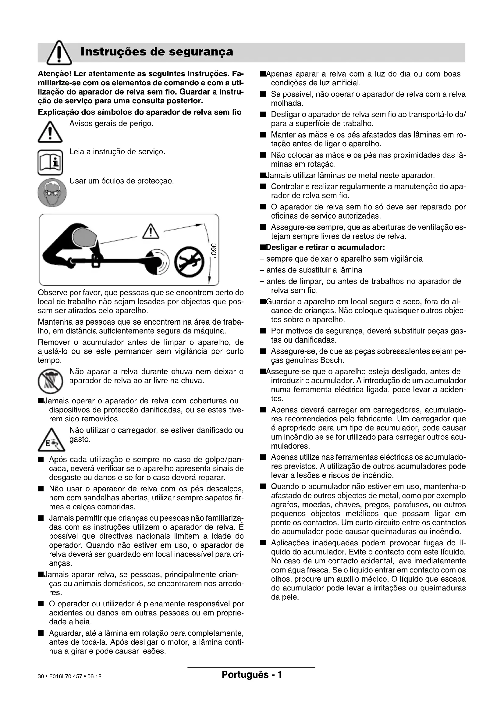 Reservado el derecho de modificaciones Eliminación Servicio de asistencia técnica Declaración de conformidad F016L70 457.book Seite 6 Montag, 18. Dezember 2006 9:45 09 29 • F016L70 457 • 06.12Português - 1 Atenção! Ler atentamente as seguintes instruções. Fa- miliarize-se com os elementos de comando e com a uti- lização do aparador de relva sem fio. Guardar a instru- ção de serviço para uma consulta posterior. Explicação dos símbolos do aparador de relva sem fio Avisos gerais de perigo. Leia a instrução de serviço. Usar um óculos de protecção. Observe por favor, que pessoas que se encontrem perto do local de trabalho não sejam lesadas por objectos que pos- sam ser atirados pelo aparelho. Mantenha as pessoas que se encontrem na área de traba- lho, em distância suficientemente segura da máquina. Remover o acumulador antes de limpar o aparelho, de ajustá-lo ou se este permancer sem vigilância por curto tempo. Não aparar a relva durante chuva nem deixar o aparador de relva ao ar livre na chuva. ■ Jamais operar o aparador de relva com coberturas ou dispositivos de protecção danificadas, ou se estes tive- rem sido removidos. Não utilizar o carregador, se estiver danificado ou gasto. ■ Após cada utilização e sempre no caso de golpe/pan- cada, deverá verificar se o aparelho apresenta sinais de desgaste ou danos e se for o caso deverá reparar. ■ Não usar o aparador de relva com os pés descalços, nem com sandalhas abertas, utilizar sempre sapatos fir- mes e calças compridas. ■ Jamais permitir que crianças ou pessoas não familiariza- das com as instruções utilizem o aparador de relva. É possível que directivas nacionais limitem a idade do operador. Quando não estiver em uso, o aparador de relva deverá ser guardado em local inacessível para cri- anças. ■ Jamais aparar relva, se pessoas, principalmente crian- ças ou animais domésticos, se encontrarem nos arredo- res. ■ O operador ou utilizador é plenamente responsável por acidentes ou danos em outras pessoas ou em proprie- dade alheia. ■ Aguardar, até a lâmina em rotação para completamente, antes de tocá-la. Após desligar o motor, a lâmina conti- nua a girar e pode causar lesões. ■ Apenas aparar a relva com a luz do dia ou com boas condições de luz artificial. ■ Se possível, não operar o aparador de relva com a relva molhada. ■ Desligar o aparador de relva sem fio ao transportá-lo da/ para a superfície de trabalho. ■ Manter as mãos e os pés afastados das lâminas em ro- tação antes de ligar o aparelho. ■ Não colocar as mãos e os pés nas proximidades das lâ- minas em rotação. ■ Jamais utilizar lâminas de metal neste aparador. ■ Controlar e realizar regularmente a manutenção do apa- rador de relva sem fio. ■ O aparador de relva sem fio só deve ser reparado por oficinas de serviço autorizadas. ■ Assegure-se sempre, que as aberturas de ventilação es- tejam sempre livres de restos de relva. ■ Desligar e retirar o acumulador: – sempre que deixar o aparelho sem vigilância – antes de substituir a lâmina – antes de limpar, ou antes de trabalhos no aparador de relva sem fio. ■ Guardar o aparelho em local seguro e seco, fora do al- cance de crianças. Não coloque quaisquer outros objec- tos sobre o aparelho. ■ Por motivos de segurança, deverá substituir peças gas- tas ou danificadas. ■ Assegure-se, de que as peças sobressalentes sejam pe- ças genuínas Bosch. ■ Assegure-se que o aparelho esteja desligado, antes de introduzir o acumulador. A introdução de um acumulador numa ferramenta eléctrica ligada, pode levar a aciden- tes. ■ Apenas deverá carregar em carregadores, acumulado- res recomendados pelo fabricante. Um carregador que é apropriado para um tipo de acumulador, pode causar um incêndio se se for utilizado para carregar outros acu- muladores. ■ Apenas utilize nas ferramentas eléctricas os acumulado- res previstos. A utilização de outros acumuladores pode levar a lesões e riscos de incêndio. ■ Quando o acumulador não estiver em uso, mantenha-o afastado de outros objectos de metal, como por exemplo agrafos, moedas, chaves, pregos, parafusos, ou outros pequenos objectos metálicos que possam ligar em ponte os contactos. Um curto circuito entre os contactos do acumulador pode causar queimaduras ou incêndio. ■ Aplicações inadequadas podem provocar fugas do lí- quido do acumulador. Evite o contacto com este líquido. No caso de um contacto acidental, lave imediatamente com água fresca. Se o líquido entrar em contacto com os olhos, procure um auxílio médico. O líquido que escapa do acumulador pode levar a irritações ou queimaduras da pele. Instruções de segurança 360° F016L70 457.book Seite 1 Montag, 18. Dezember 2006 9:45 09 30 • F016L70 457 • 06.12Português - 2 O aparelho é destinado para cortar relva e ervas da- ninhas sob arbustos, assim como em ribanceiras e cantos, que não podem ser alcançados com o corta- relvas. A utilização conforme às disposições refere-se a uma temperatura ambiente entre 0 °C e 40 °C. Este manual contém instruções sobre a montagem correcta e a utilização segura do seu aparelho. É im- portante que estas instruções sejam lidas com aten- ção. Retirar o aparador de relva sem fio cuidadosamente da embalagem e verificar se as seguintes peças es- tão completas: – Aparador – Capa de protecção – Prato de corte – Lâmina de corte – Carregador – Instrução de serviço Se quaisquer peças estiverem faltando ou danificadas, di- rija-se ao seu revendedor autorizado. 1 Interruptor de ligar/desligar 2 Punho 3 Punho de guia 4 Parte superior do cabo 5 Parte inferior do cabo 6 Cabeçote do aparador 7 Aberturas de ventilação 8 Capa de protecção 9 Acumulador 10 Carregador 11 Compartimento de carga do acumulador 12 Indicação LED 13 Ficha de rede** 14 Número de série **específico para cada país Os acessórios ilustrados e descr