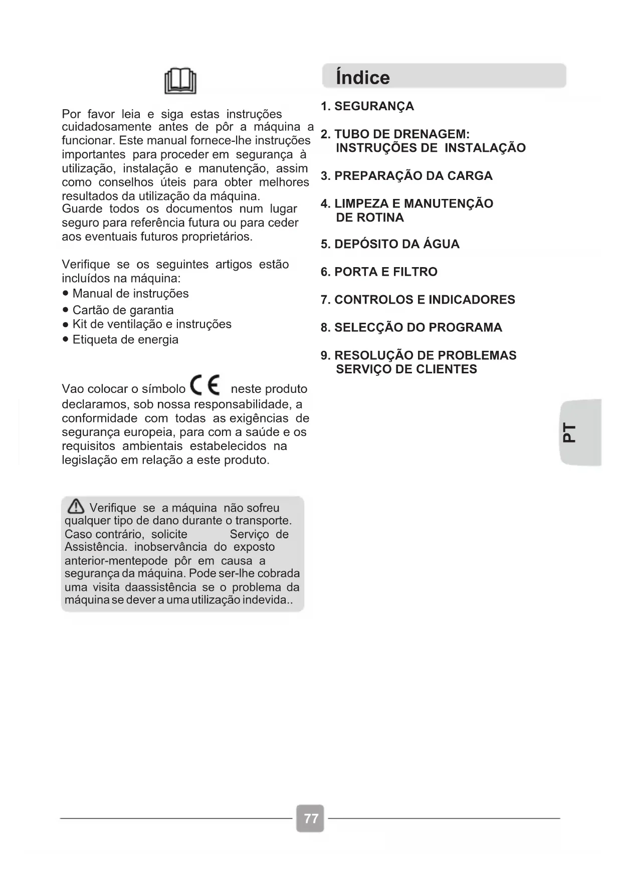 Índice Por favor leia e siga estas instruções cuidadosamente antes de pôr a máquina a funcionar. Este manual fornece-lhe instruções importantes para proceder em segurança à utilização, instalação e manutenção, assim como conselhos úteis para obter melhores resultados da utilização da máquina.Guarde todos os documentos num lugar seguro para referência futura ou para ceder aos eventuais futuros proprietários.Verifique se os seguintes artigos estão incluídos na máquina:● Manual de instruções● Cartão de garantia● Kit de ventilação e instruções● Etiqueta de energiaVao colocar o símbolo neste produto declaramos, sob nossa responsabilidade, a conformidade com todas as exigências de segurança europeia, para com a saúde e os requisitos ambientais estabelecidos na legislação em relação a este produto.1. SEGURANÇA2. TUBO DE DRENAGEM: INSTRUÇÕES DE INSTALAÇÃO3. PREPARAÇÃO DA CARGA4. LIMPEZA E MANUTENÇÃO DE ROTINA5. DEPÓSITO DA ÁGUA6. PORTA E FILTRO7. CONTROLOS E INDICADORES8. SELECÇÃO DO PROGRAMA9. RESOLUÇÃO DE PROBLEMAS SERVIÇO DE CLIENTESVerifique se a máquina não sofreu qualquer tipo de dano durante o transporte. Caso contrário, solicite Serviço de Assistência. inobservância do exposto anterior-mentepode pôr em causa a segurança da máquina. Pode ser-lhe cobrada uma visita daassistência se o problema da máquina se dever a uma utilização indevida.. PT1. SEGURANÇA Este electrodoméstico não deve ser usado por crianças com menos de 8 anos nem por p e s s o a s c o m reduzidas capacidades físicas, sensoriais ou mentais ou pessoas que tenham falta de experiência e não saibam operar com o aparelho, a menos sejam supervisionadas por alguém com experiência e que supervisione a sua segurança e que entenda os riscos envolvidos. As crianças não devem brincar com o electrodoméstico. A limpeza e manutenção também não devem ser feitas por crianças. A má utilização de uma máquina de secar pode criar risco de incêndio Este electrodoméstico foi concebido para ser utilizado a p e n a s e m a m b i e n t e s domésticos ou similares, tais como: -Pequenas cozinhas de staff em lojas, escritórios e outros ambientes de trabalho; -Turismo rural ou de habitação; -Por clientes alojados em hotéis, motéis ou outro género de residenciais e afins; Alojamento tipo “cama e pequeno-almoço” . Uma utilização diferente deste electrodoméstico em situações que não sejam as tarefas domésticas para que foi concebido, tal como utilizações comerciais ou profissionais, estão excluídas das utilizações e x p l i c i t a d a s e e m conformidade. Se o aparelho for utilizado para além das situações previstas, isso pode reduzir a vida útil do electrodoméstico e anular a garantia do fabricante, dado que as utilizações não foram as previstas em conformidade com o uso a que o aparelho se destina.Qualquer dano no equipamento que seja devido a utilizações não conformes com o que é suposto com a utilização doméstica e familiar (mesmo que o aparelho esteja localizado em casa), não são cobertas pela garantia dada por lei. Esta máquina destina-se apenas a uso doméstico, ou seja, para secar têxteis e vestuário domésticos. Esta máquina deve apenas ser utilizada para os fins para os quais foi concebida, conforme descrito neste manual. Certifique-se de que compreende perfeitamente as instruções de instalação e utilização antes de colocar a máquina em funcionamento. Não toque na máquina com as mãos ou pés húmidos ou molhados. Não se apoie na porta ao carregar a máquina ou utilize a porta para erguer ou mover a máquina.