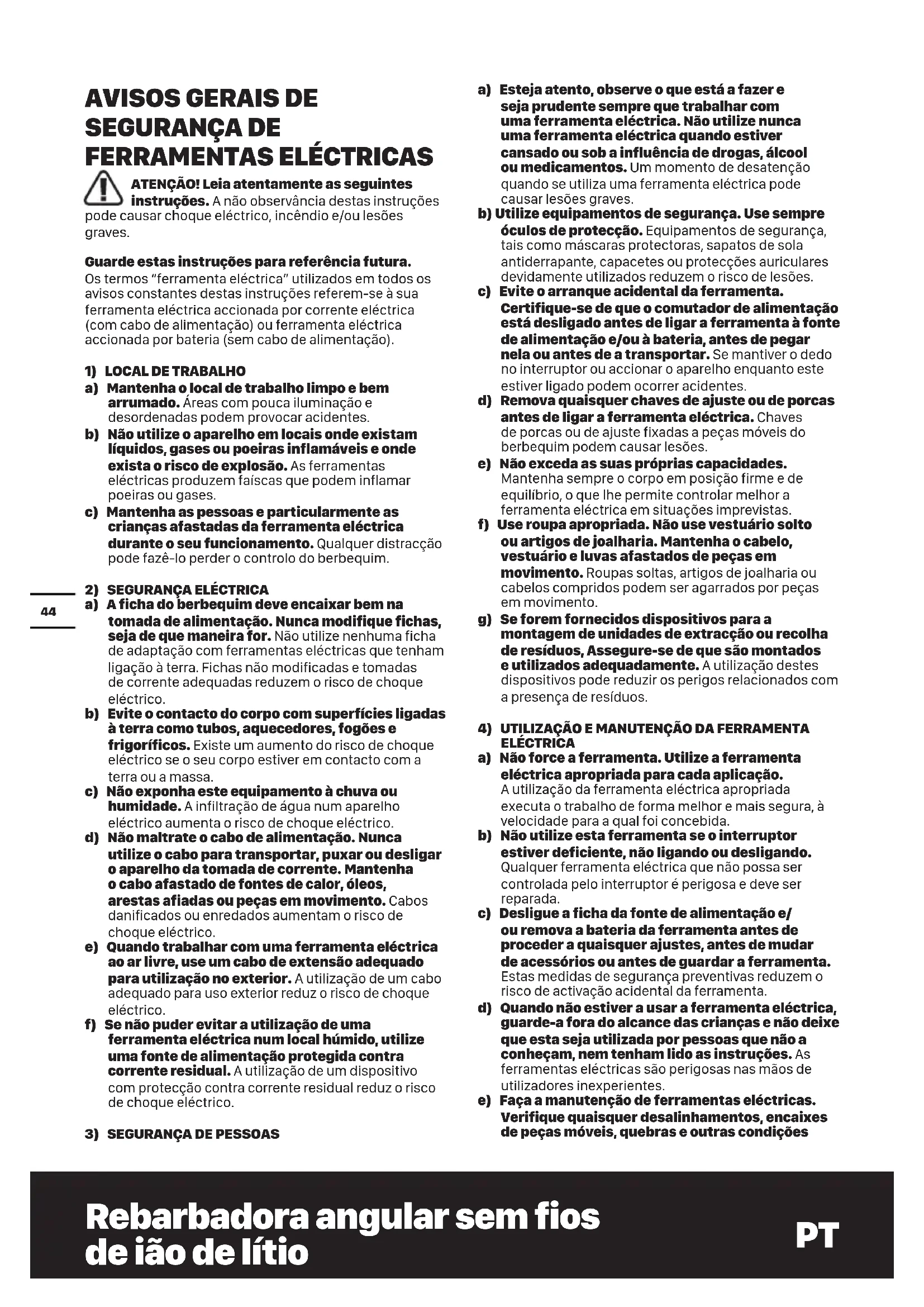 ATENÇÃO! Leia atentamente as seguintes instruções. A não observância destas instruções pode causar choque eléctrico, incêndio e/ou lesões graves. Guarde estas instruções para referência futura. Os termos “ferramenta eléctrica” utilizados em todos os avisos constantes destas instruções referem-se à sua ferramenta eléctrica accionada por corrente eléctrica (com cabo de alimentação) ou ferramenta eléctrica accionada por bateria (sem cabo de alimentação).