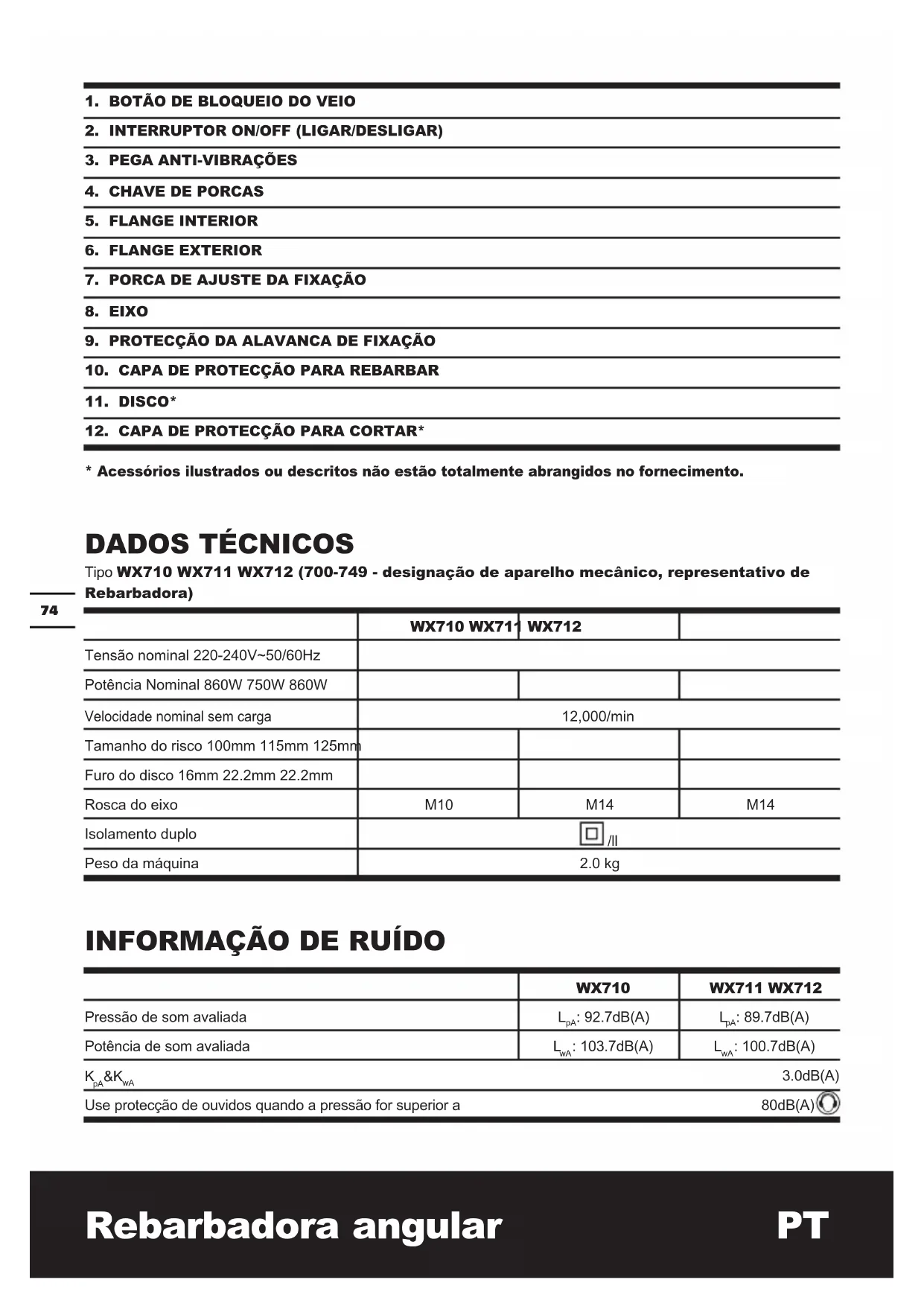 Tipo WX710 WX711 WX712 (700-749 - designação de aparelho mecânico, representativo de Rebarbadora) WX710 WX711 WX712 Tensão nominal 220-240V~50/60Hz Potência Nominal 860W 750W 860W Velocidade nominal sem carga 12,000/min Tamanho do risco 100mm 115mm 125mm Furo do disco 16mm 22.2mm 22.2mm Rosca do eixo M10 M14 M14 Isolamento duplo /ll Peso da máquina 2.0 kg