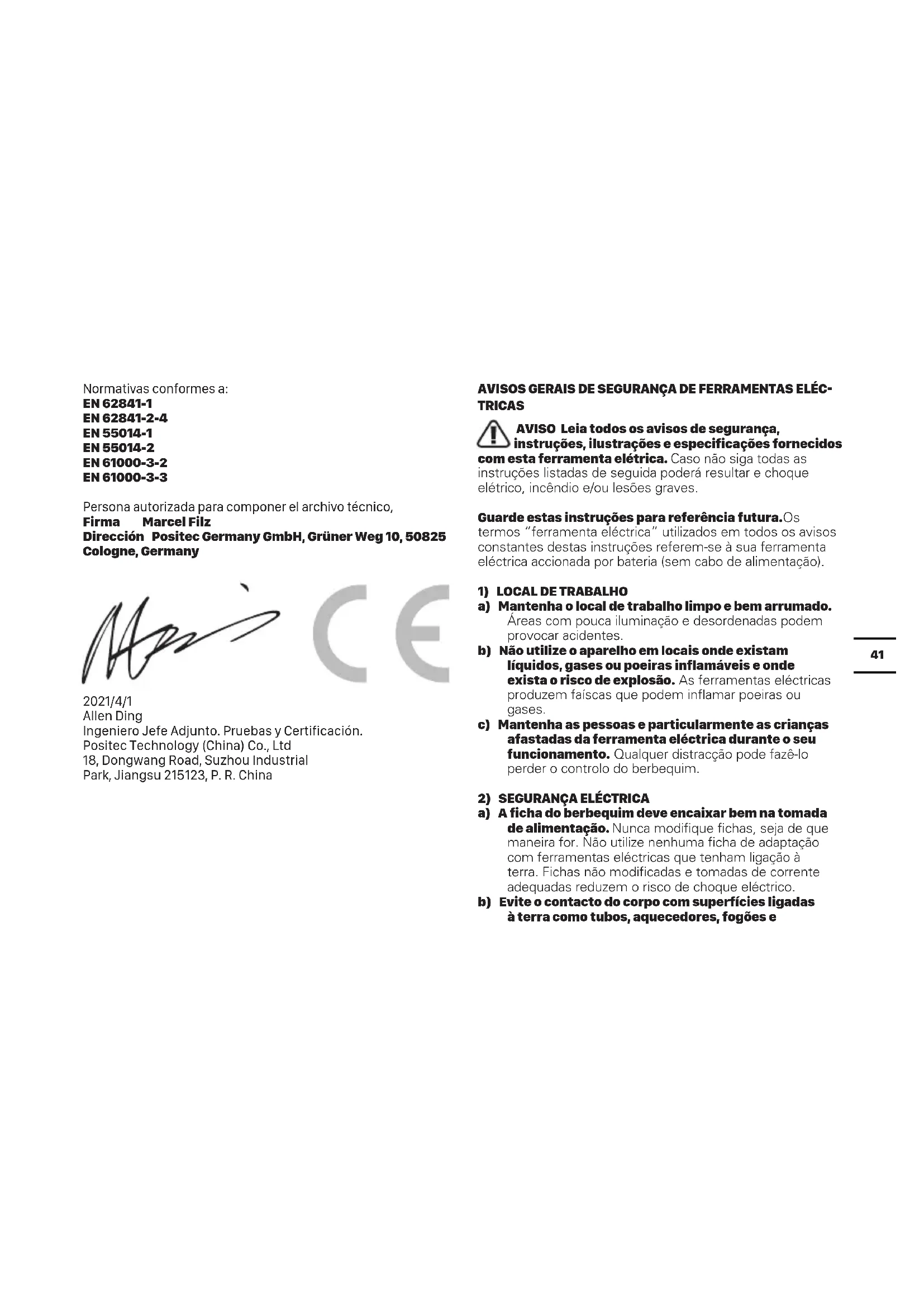 e) Não exceedas as suas proprias capacidades. Mantenha sempre o corpo em posicao firme e de equilibrio, o que lhe permitte controlar melhor a ferramenta eletrica em situações imprevistas.