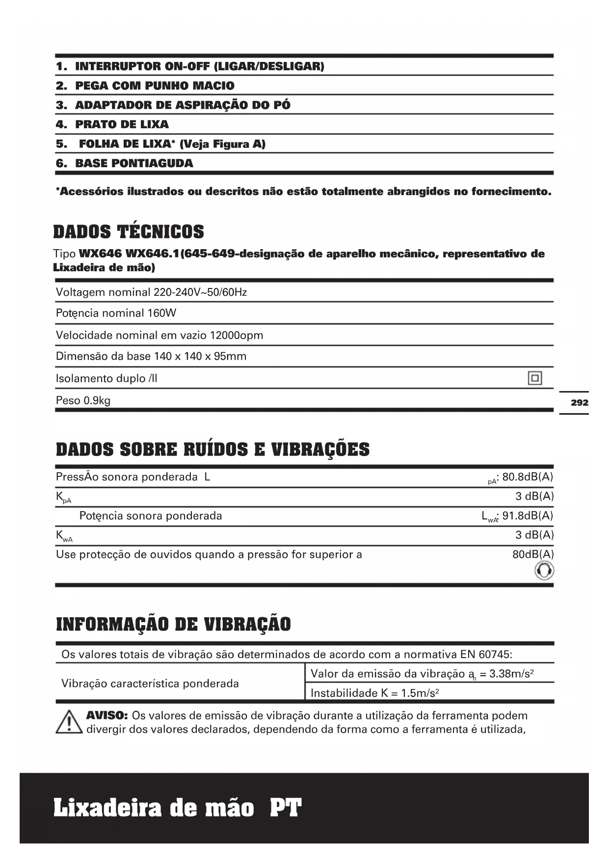 Tipo WX646 WX646.1(645-649-designação de aparelho mecânico, representativo de Lixadeira de mão) DADOS SOBRE RUÍDOS E VIBRAÇÕES PressÃo sonora ponderada L