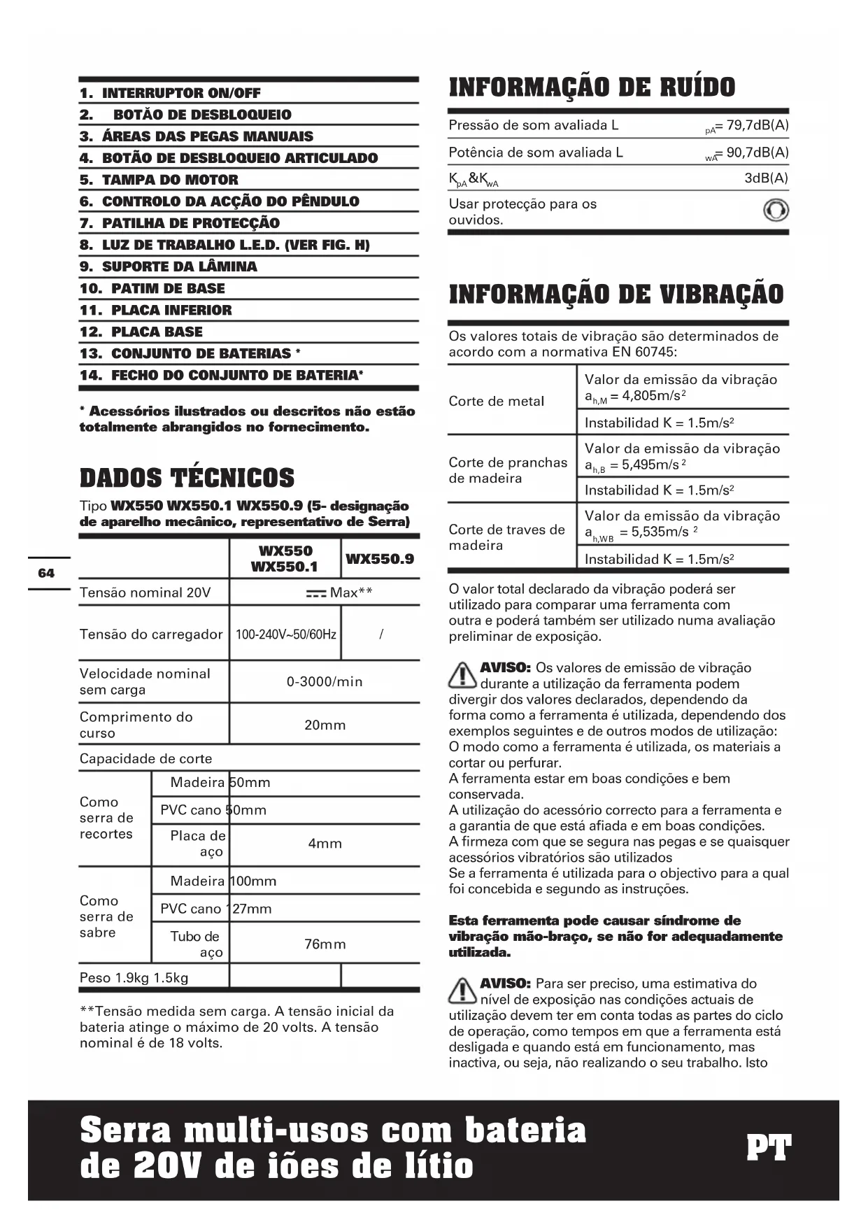 C ou inferior. Planeie o seu horário de trabalho de forma a distribuir a utilização de ferramentas de alta vibração ao longo de vários dias. ACESSÓRIOS WX550 WX550.1 WX550.9 1 hora Carregador (WA3860) 1 1 / Conjunto de Baterias de 1.3 Ah (WA3551.1) 1 2 / Lâmina de serra pendular para corte em madeira