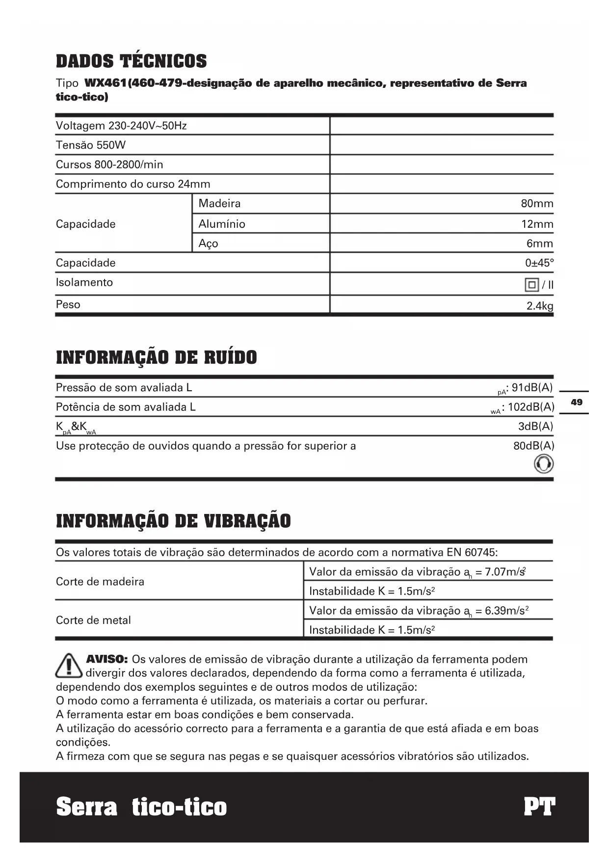 Tipo WX461(460-479-designação de aparelho mecânico, representativo de Serra tico-tico) Voltagem 230-240V~50Hz Tensăo 550W Cursos 800-2800/min Comprimento do curso 24mm Capacidade Madeira 80mm Alumínio 12mm Aço 6mm Capacidade 0±45° Isolamento / II Peso 2.4kg