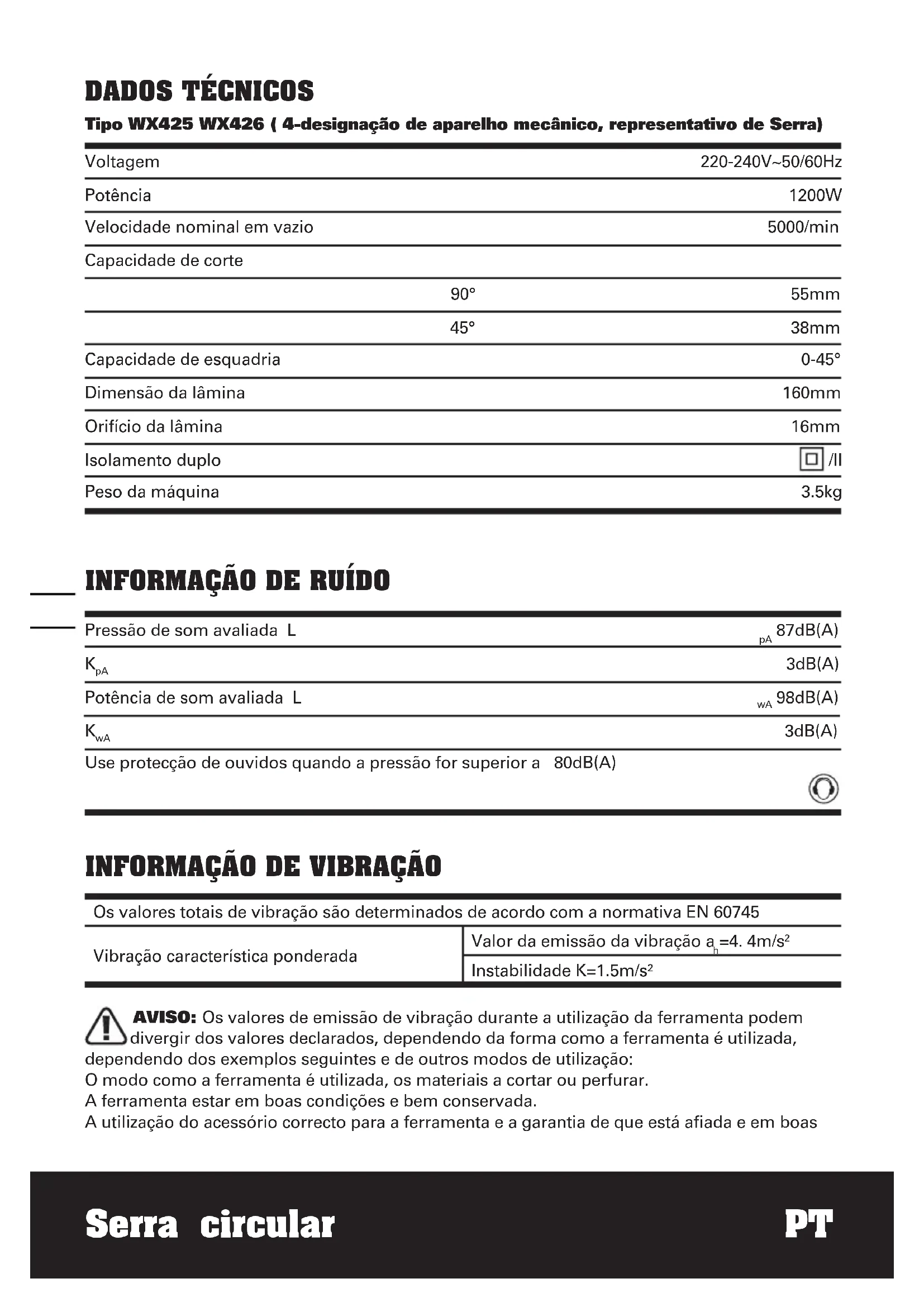 Instabilidade K=1.5m/s² AVISO: Os valores de emissão de vibração durante a utilização da ferramenta podem divergir dos valores declarados, dependendo da forma como a ferramenta é utilizada, dependendo dos exemplos seguintes e de outros modos de utilização: O modo como a ferramenta é utilizada, os materiais a cortar ou perfurar. A ferramenta estar em boas condições e bem conservada. A utilização do acessório correcto para a ferramenta e a garantia de que está afiada e em boas Voltagem Potência Velocidade nominal em vazio Capacidade de corte 90° 45° Capacidade de esquadria Dimensão da lâmina Orifício da lâmina Isolamento duplo Peso da máquina 220-240V~50/60Hz 1200W 5000/min 55mm 38mm 0-45° 160mm 16mm /II 3.5kgSerra circular PT