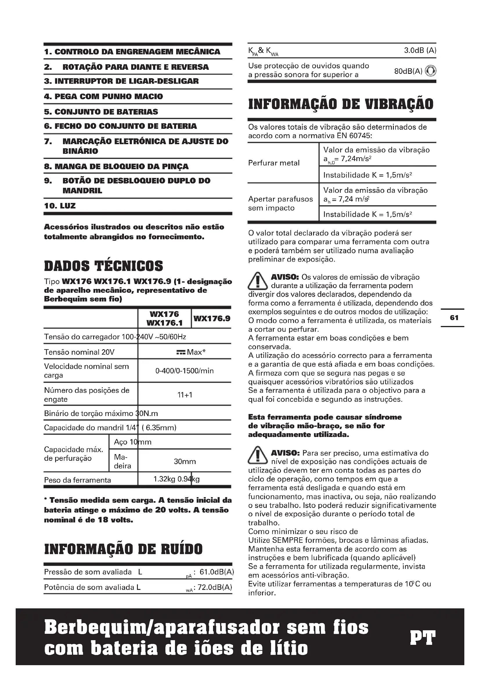 Tipo WX176 WX176.1 WX176.9 (1- designação de aparelho mecânico, representativo de Berbequim sem fio) WX176 WX176.1 WX176.9 Tensão do carregador 100-240V ~50/60Hz Tensão nominal 20V Max* Velocidade nominal sem carga 0-400/0-1500/min Número das posições de engate 11+1 Binário de torção máximo 30N.m Capacidade do mandril 1/4” ( 6.35mm) Capacidade máx. de perfuração Aço 10mm Ma- deira 30mm Peso da ferramenta 1.32kg 0.94kg