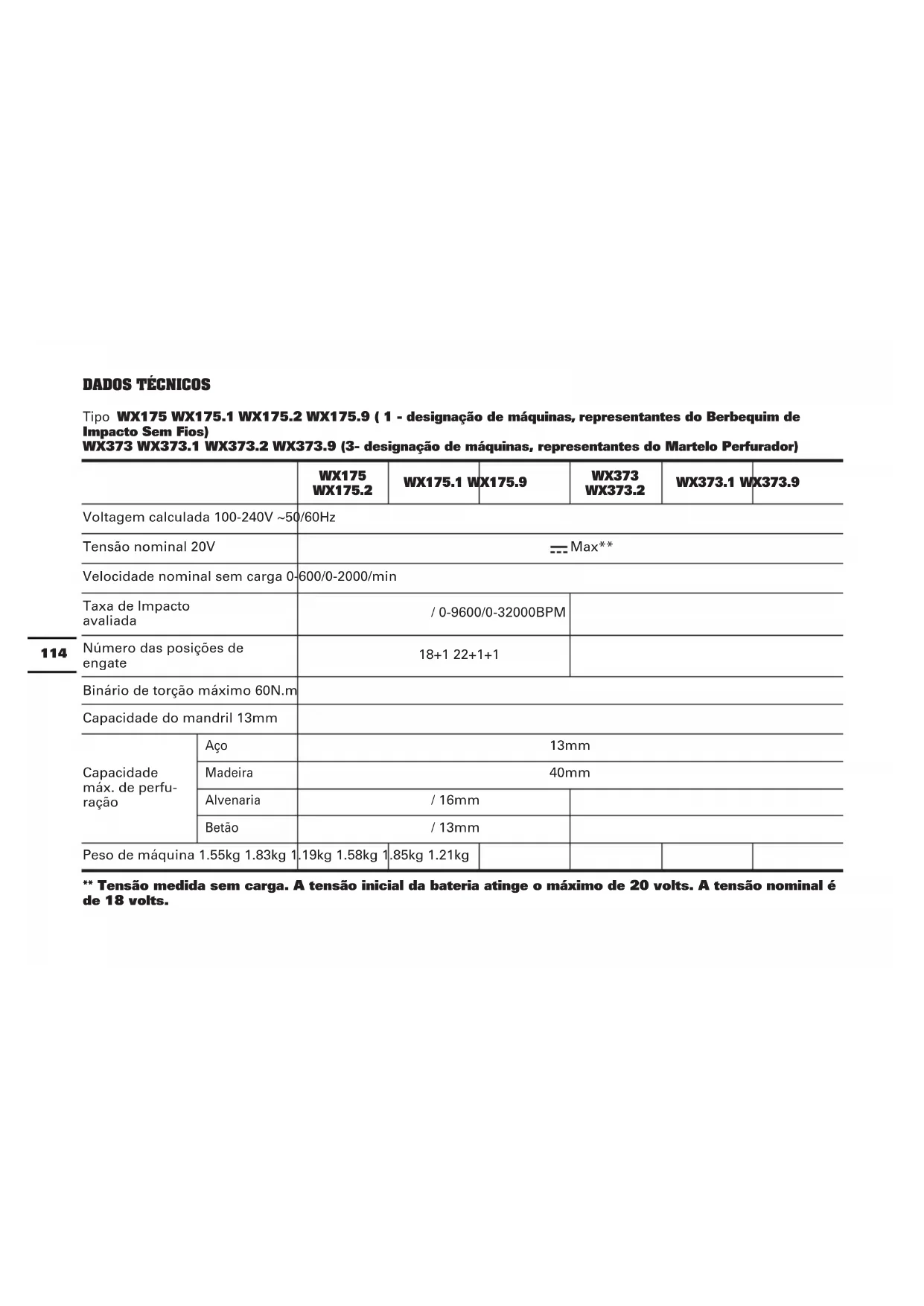 NOTA: Antes de usar a ferramenta, leia o livro de instruções cuidadosamente. ÂMBITO DE UTILIZAÇÃO (PARA WX175 WX175.1 WX175.2 WX175.9) A ferramenta eléctrica destina-se a apertar e desapertar parafusos, assim como para furar em madeira, metal e plástico. ÂMBITO DE UTILIZAÇÃO (PARA WX373 WX373.1 WX373.2 WX373.9) O aparelho é destinado para furar com percussão em tijolos, betão e pedra, assim como furar em madeira, metal, cerâmica e plástico.