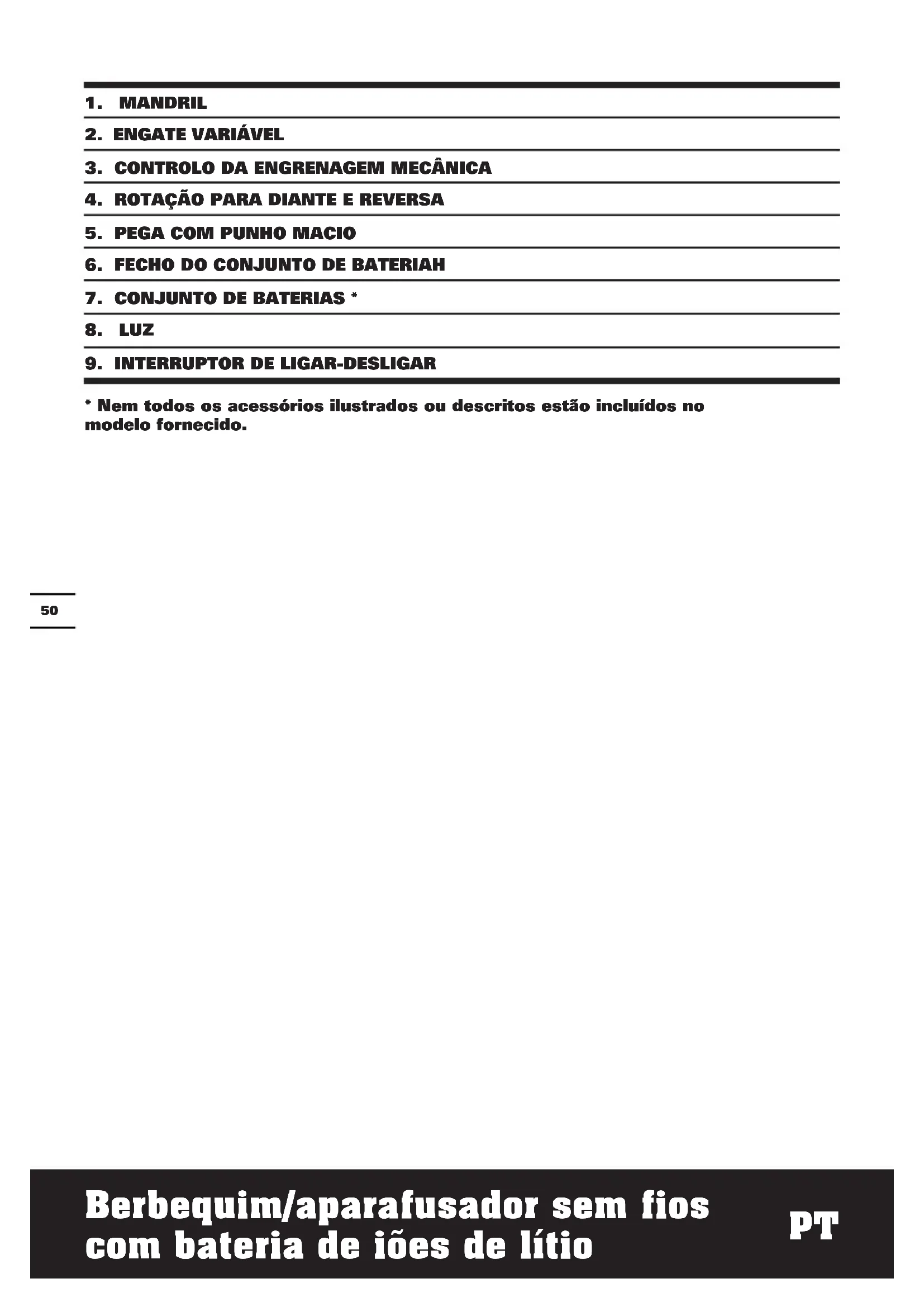 - Nem todos os acessórios ilustrados ou descritos estão incluídos no modelo fornecido.51 Berbequim/aparafusador sem fios com bateria de iões de lítio