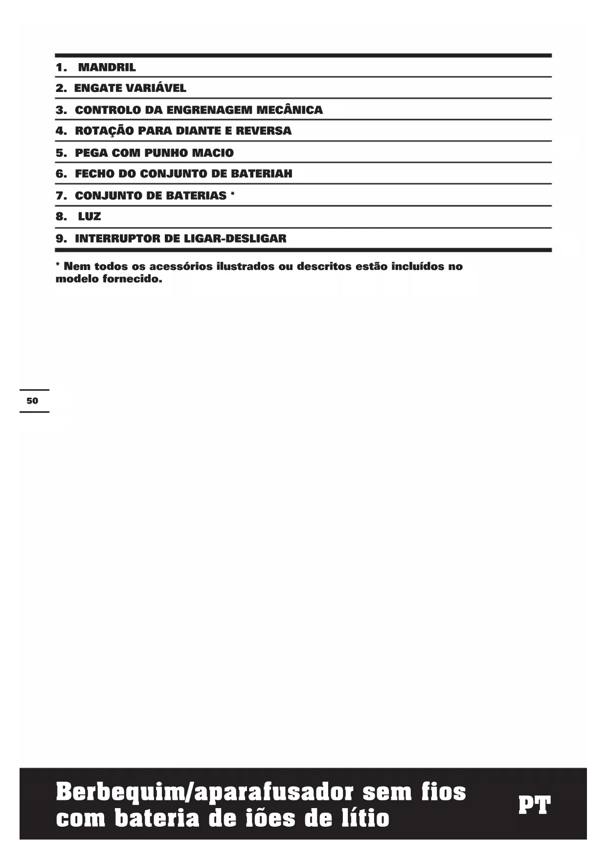 - Nem todos os acessórios ilustrados ou descritos estão incluídos no modelo fornecido.51 Berbequim/aparafusador sem fios com bateria de iões de lítio