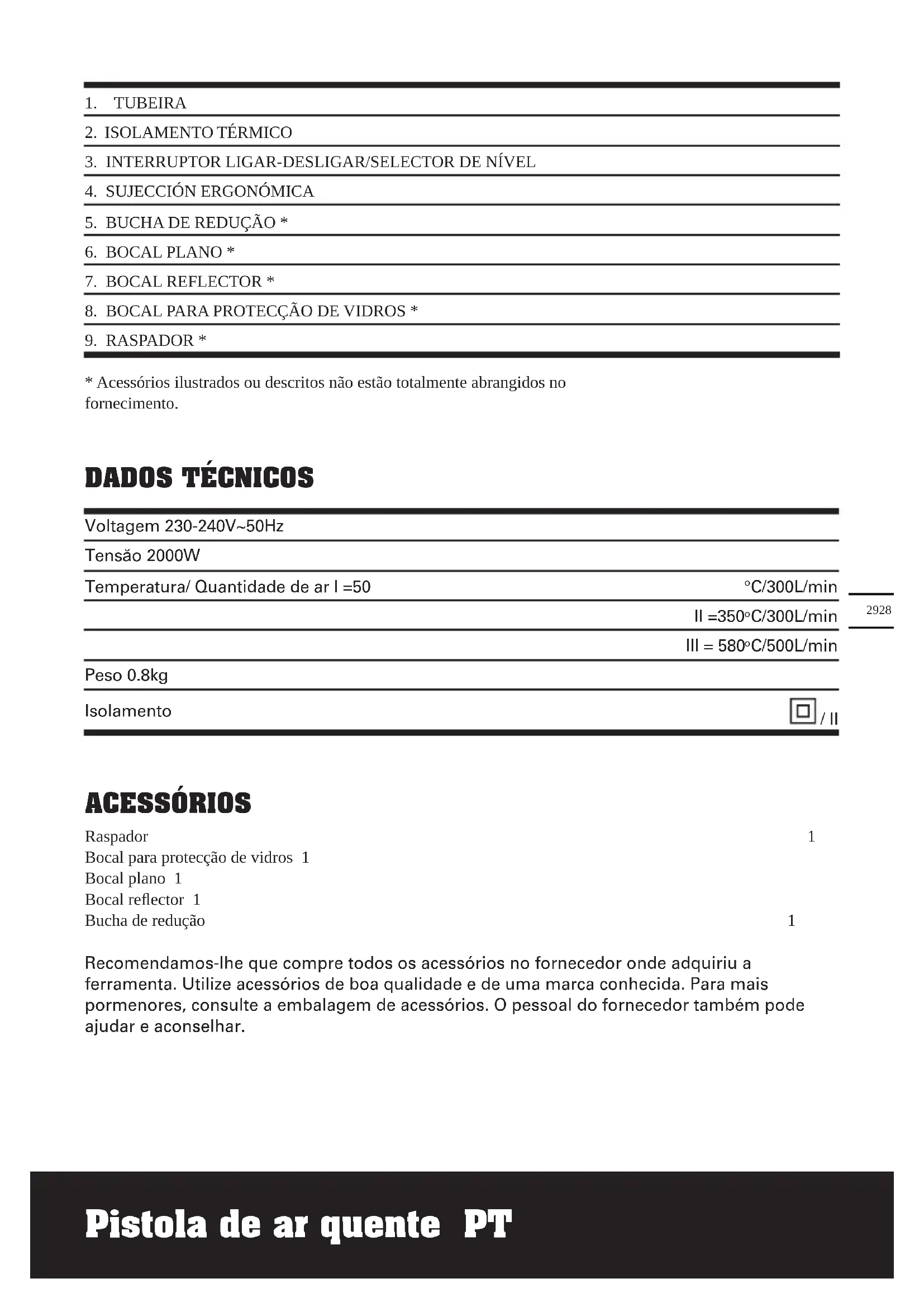 C/500L/min Peso 0.8kg Isolamento / II ACESSÓRIOS Raspador 1 Bocal para protecção de vidros 1 Bocal plano 1 Bocal reflector 1 Bucha de redução 1 Recomendamos-lhe que compre todos os acessórios no fornecedor onde adquiriu a ferramenta. Utilize acessórios de boa qualidade e de uma marca conhecida. Para mais pormenores, consulte a embalagem de acessórios. O pessoal do fornecedor também pode ajudar e aconselhar. Pistola de ar quente PTPistola de ar quente PT