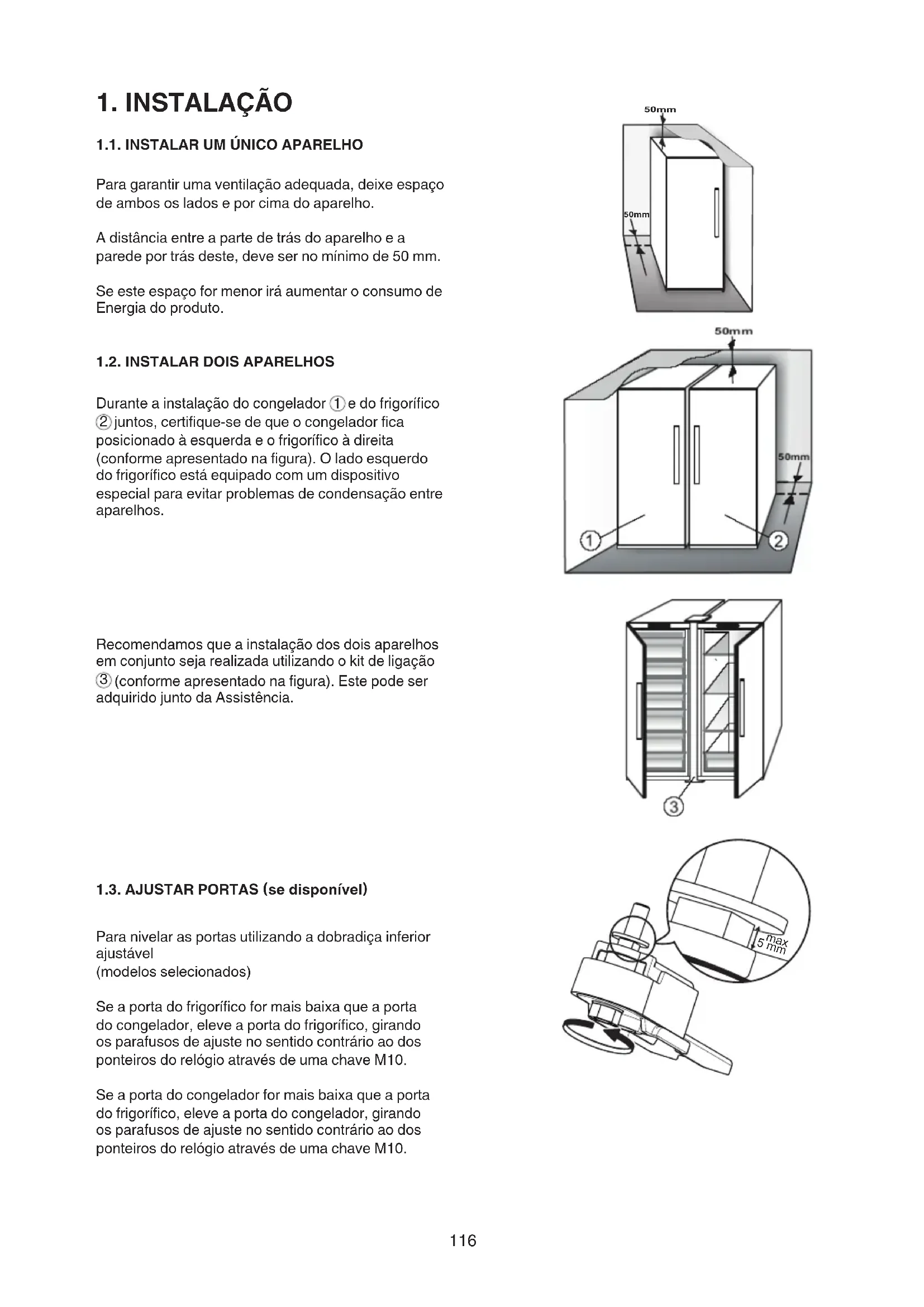 (conforme apresentado na figura). Este pode ser adquirido junto da Assistência. 1.3. AJUSTAR PORTAS (se disponível) Para nivelar as portas utilizando a dobradiça inferior ajustável (modelos selecionados) Se a porta do frigorífico for mais baixa que a porta do congelador, eleve a porta do frigorífico, girando os parafusos de ajuste no sentido contrário ao dos ponteiros do relógio através de uma chave M10. Se a porta do congelador for mais baixa que a porta do frigorífico, eleve a porta do congelador, girando os parafusos de ajuste no sentido contrário ao dos ponteiros do relógio através de uma chave M10. 50mm 50mm 5 mm max117