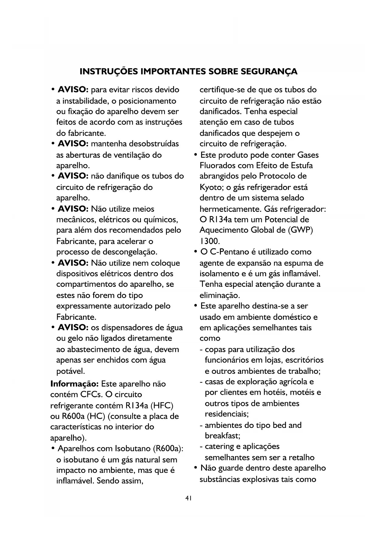 - AVISO: os dispensadores de água ou gelo não ligados diretamente ao abastecimento de água, devem apenas ser enchidos com água potável. Informação: Este aparelho não contém CFCs. O circuito refrigerante contém R134a (HFC) ou R600a (HC) (consulte a placa de características no interior do aparelho).