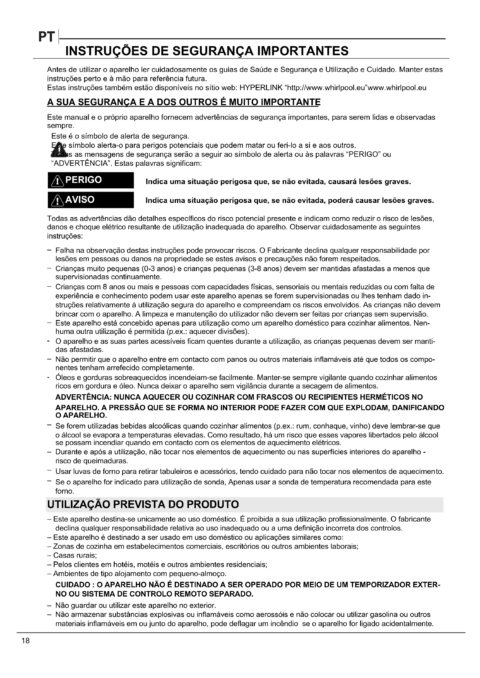 Antes de utilizar o aparelho ler cuidadosamente os guias de Saúde e Segurança e Utilização e Cuidado. Manter estas instruções perto e à mão para referência futura.Estas instruções também estão disponíveis no sítio web: HYPERLINK “http://www.whirlpool.eu”www.whirlpool.euA SUA SEGURANÇA E A DOS OUTROS É MUITO IMPORTANTEEste manual e o próprio aparelho fornecem advertências de segurança importantes, para serem lidas e observadas sempre. Este é o símbolo de alerta de segurança. Este símbolo alerta-o para perigos potenciais que podem matar ou feri-lo a si e aos outros. Todas as mensagens de segurança serão a seguir ao símbolo de alerta ou às palavras “PERIGO” ou “ADVERTÊNCIA”. Estas palavras significam: Indica uma situação perigosa que, se não evitada, causará lesões graves. Indica uma situação perigosa que, se não evitada, poderá causar lesões graves.Todas as advertências dão detalhes específicos do risco potencial presente e indicam como reduzir o risco de lesões, danos e choque elétrico resultante de utilização inadequada do aparelho. Observar cuidadosamente as seguintes instruções: Falha na observação destas instruções pode provocar riscos. O Fabricante declina qualquer responsabilidade por lesões em pessoas ou danos na propriedade se estes avisos e precauções não forem respeitados. Crianças muito pequenas (0-3 anos) e crianças pequenas (3-8 anos) devem ser mantidas afastadas a menos que supervisionadas continuamente. Crianças com 8 anos ou mais e pessoas com capacidades físicas, sensoriais ou mentais reduzidas ou com falta de experiência e conhecimento podem usar este aparelho apenas se forem supervisionadas ou lhes tenham dado in- struções relativamente à utilização segura do aparelho e compreendam os riscos envolvidos. As crianças não devem brincar com o aparelho. A limpeza e manutenção do utilizador não devem ser feitas por crianças sem supervisão.