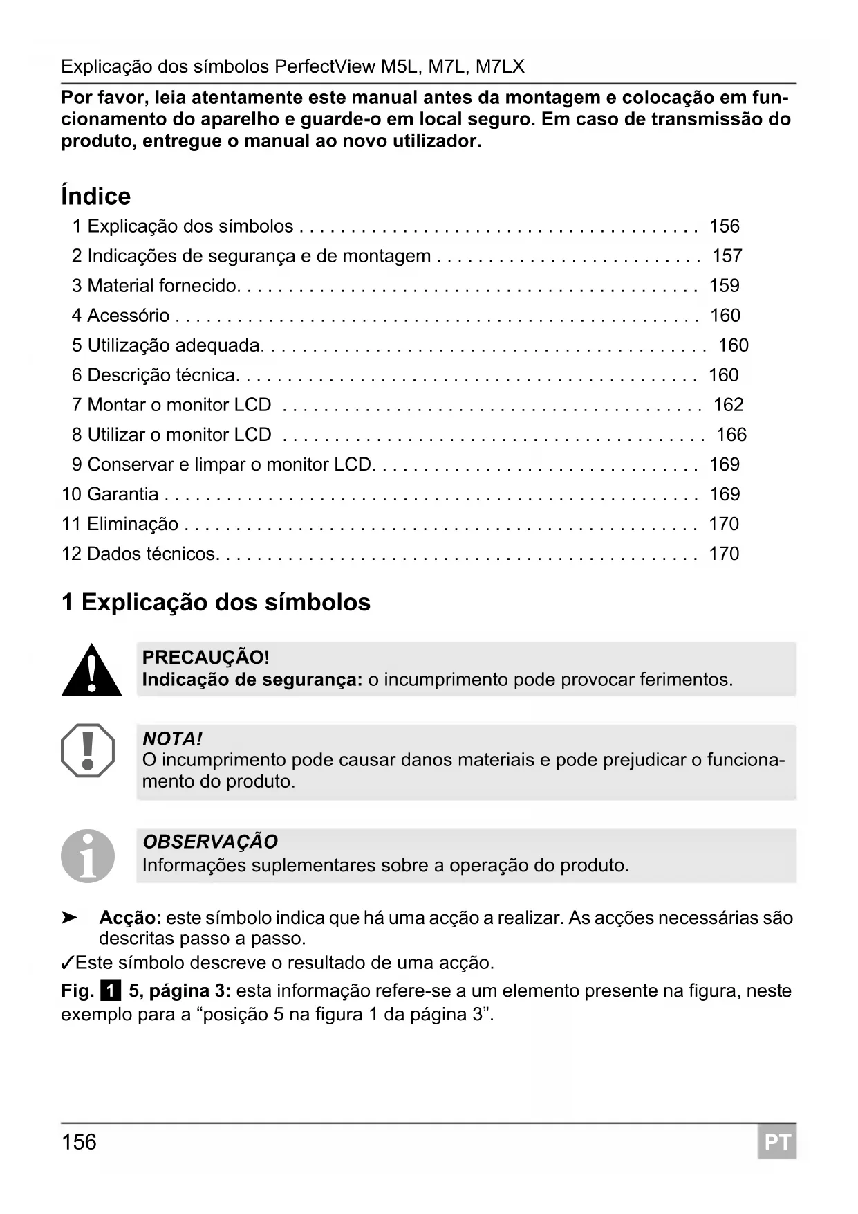 ➤ Acção: este símbolo indica que há uma acção a realizar. As acções necessárias são descritas passo a passo. ✓ Este símbolo descreve o resultado de uma acção. Fig. 1 5, página 3: esta informação refere-se a um elemento presente na figura, neste exemplo para a “posição 5 na figura 1 da página 3”. PRECAUÇÃO! Indicação de segurança: o incumprimento pode provocar ferimentos. NOTA! O incumprimento pode causar danos materiais e pode prejudicar o funciona- mento do produto. OBSERVAÇÃO Informações suplementares sobre a operação do produto.PerfectView M5L, M7L, M7LX Indicações de segurança e de montagem